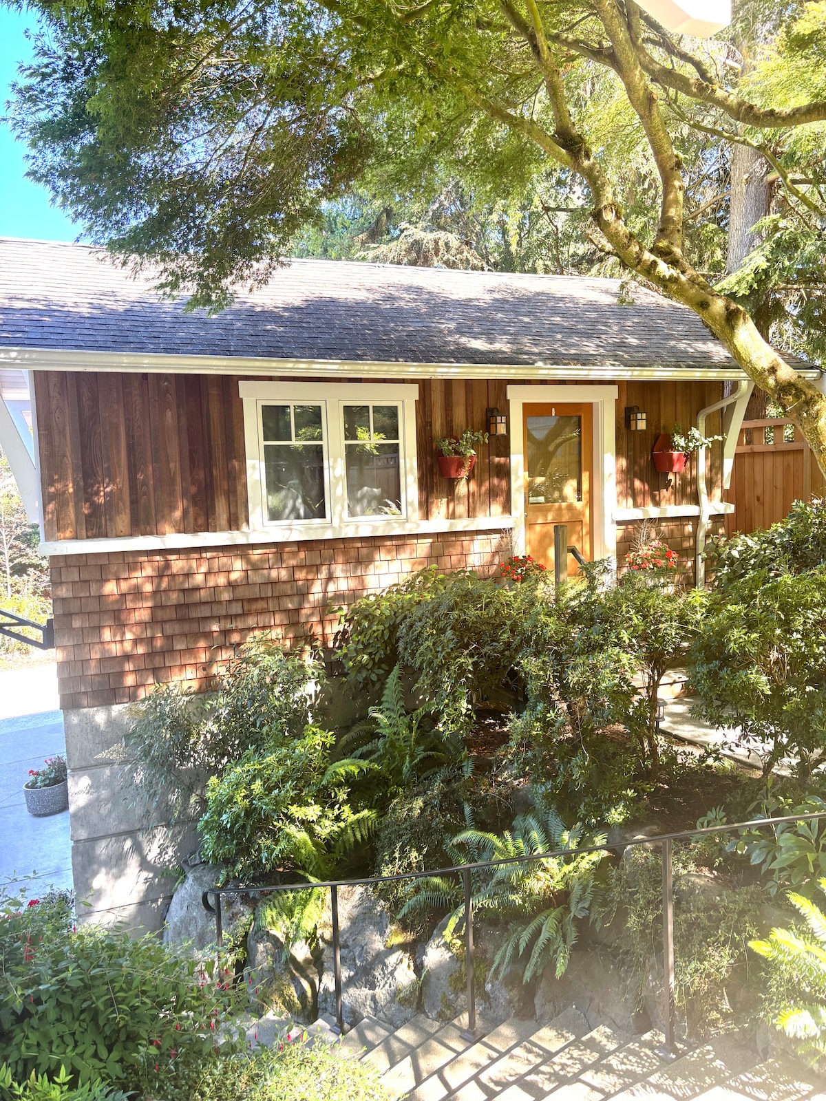 Denne leiligheten med ett soverom ligger på en nydelig eiendom i skogen, og er likevel sentralt plassert. Leiligheten er full av naturlig lys, har persisk teppe dekket bambusgulv overalt, et kjøkken med kvartsbenkeplate, fullt flislagt bad: gulv og dusj, og har en bemerkelsesverdig komfortabel kingsize memory foam-seng. To par franske dører åpner stuen opp mot hagen. Longfellow Creek grenser til eiendommen, inkludert bever, og et nettverk av parkstier også.