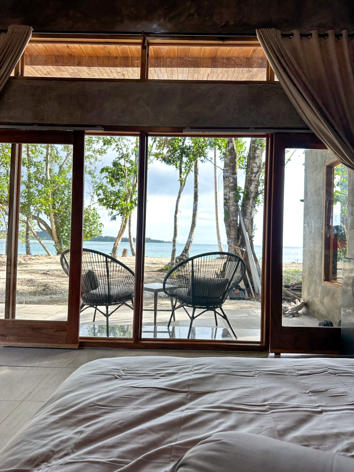 Exclusive beachfront studio on Sipora Island, Mentawai, directly in front of the iconic Telescopes wave. The only studio in the area, offering total privacy and a serene, almost private beach experience. Designed for comfort and style, it features a king-size bed, AC, refrigerator, coffee machine, hot water, and a dining table for two. Meals, a motorbike, and round-trip harbor transfer are included. Enjoy breathtaking sunsets from your private oceanfront balcony.