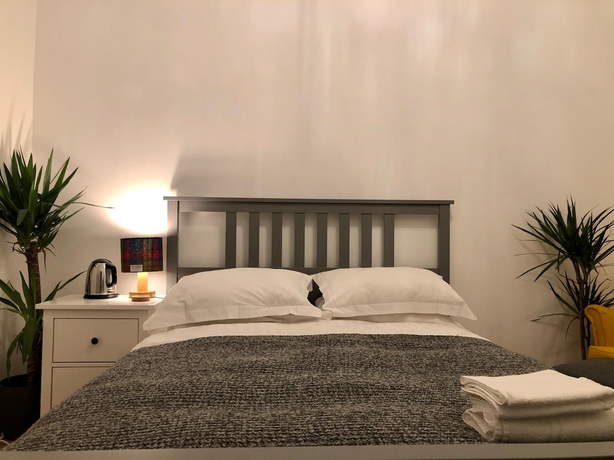 Soverom med kingsize-seng og eget bad i et vakkert georgiansk fireetasjes byhus på et pittoresk hagetorg i UNESCOs verdensarv New Town. Denne nyoppussede kjellerleiligheten har sin egen private inngangsdør. Huset ligger i Stockbridge-området i Edinburgh, nær sentrum, minutter unna fantastiske håndverkskaféer, fantastiske restauranter, delikatessebutikker, barer, uavhengige butikker og gallerier. Over torget ligger Glenogle Baths med treningsstudio, sauna og svømmebasseng.