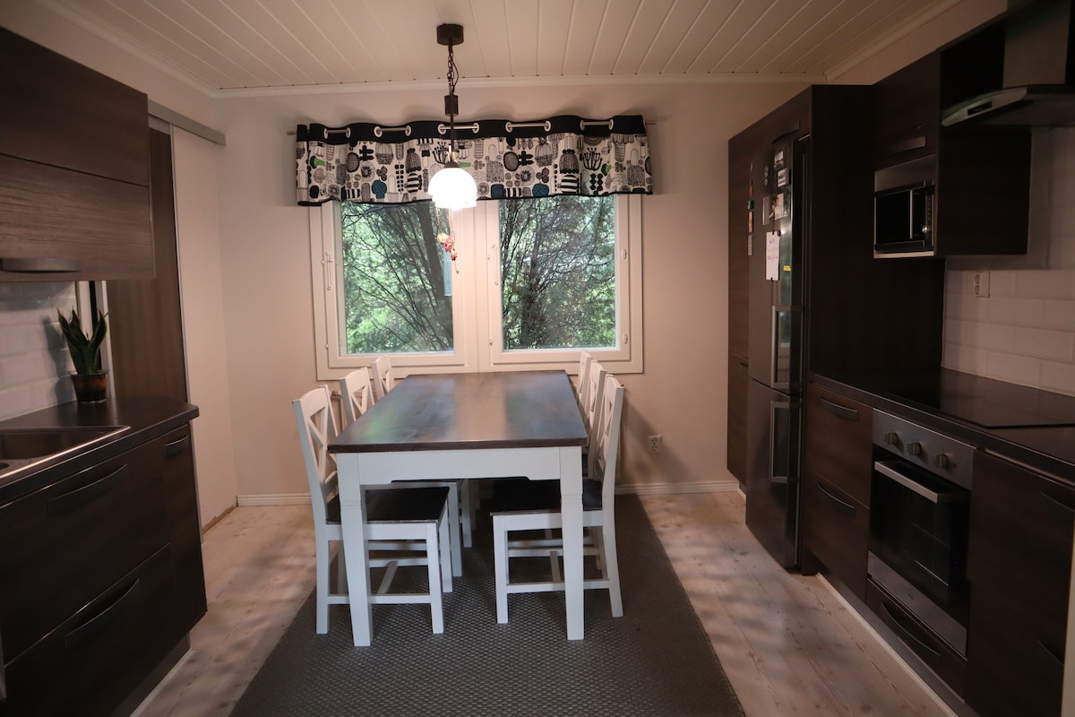 Den andre halvdelen av et tomannsbolig, verten bor på den andre siden. Et par soverom, store salonger, et kjøkken og en badstueavdeling. Det er også en terrasse og en inngjerdet bakgård. Fredelig område med eneboliger. Vi er i nærheten av en innsjø, men det er ingen tilgang til stranden. De nærmeste strendene er Eastern eller Matkolamm-stranden, begge ca. 1,5 km unna. Senteret i Hämeenlinna ligger litt over tre kilometer unna, og den nærmeste golfbanen ligger litt over én kilometer unna.
