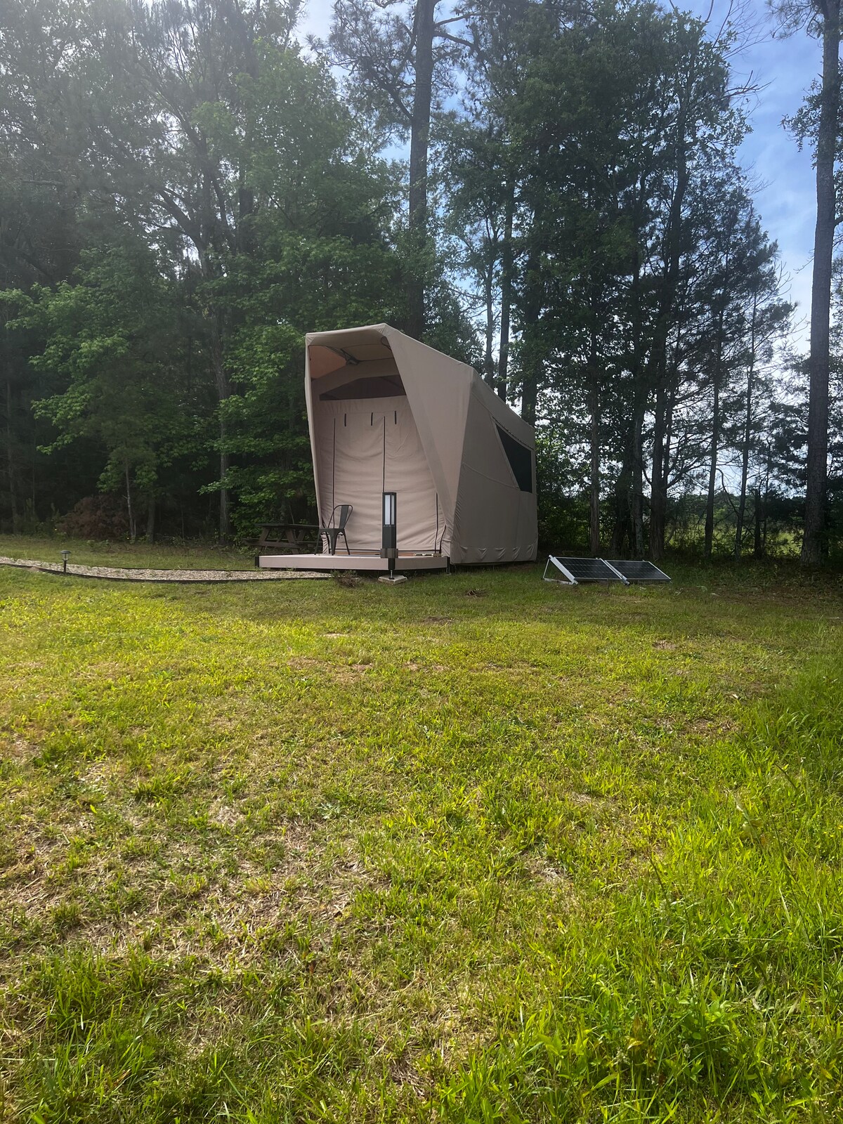 Leir i luksus i dette Glampingteltet! Perfekt for de eventyrlystne menneskene som liker å campe, men slappe av uten å være grov. Dette er et lerretelt med et komplett bad, varme og luft, og komfortable oppholdsfasiliteter som TV og varmt vann. Perfekt for helgetur, eller ditt neste fotturer, sykling eller campingeventyr. Praktisk plassert i Travelers Rest-området, mellom Greenville SC og Ashville NC. Mange tur- og sykkelhaler i nærheten. Det ligger også i nærheten av Furman University.