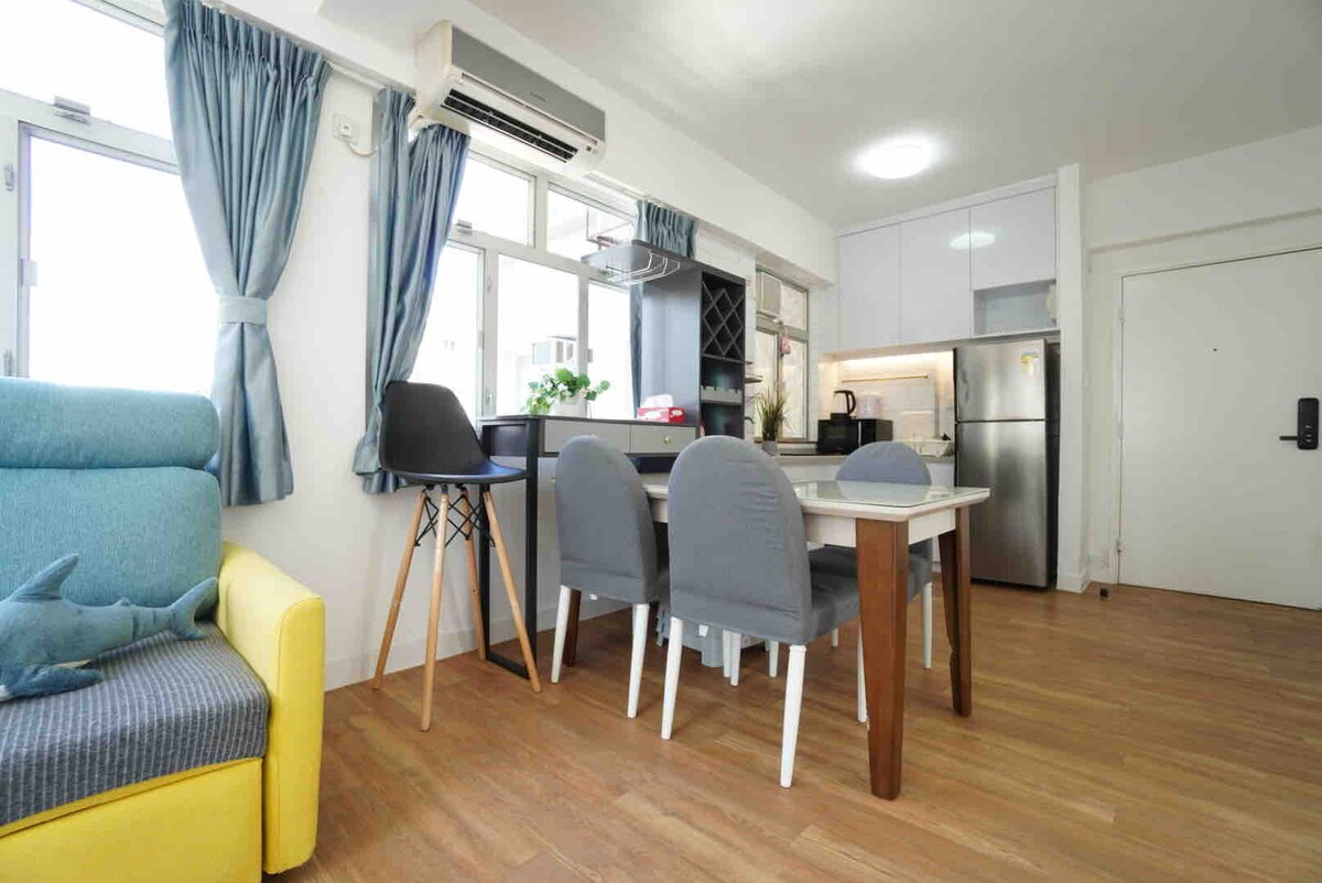 Velkommen til min nylig renoverte leilighet med to soverom i nærheten av North Point MTR-stasjonen (5–10 minutters spasertur). Den ligger i en høy etasje med delvis utsikt mot Victoria Harbor. Den har en 55-tommers TV utstyrt med Google Chromecast, Roku (med NETFLIX), lynraskt trådløst nettverk, fireseters sofa, tre veggmonterte klimaanlegg, dusj, to dobbeltmadrasser, en takvifte, en røykvarsler, induksjonskoker, en vaskemaskin og en mikrobølgeovn.
