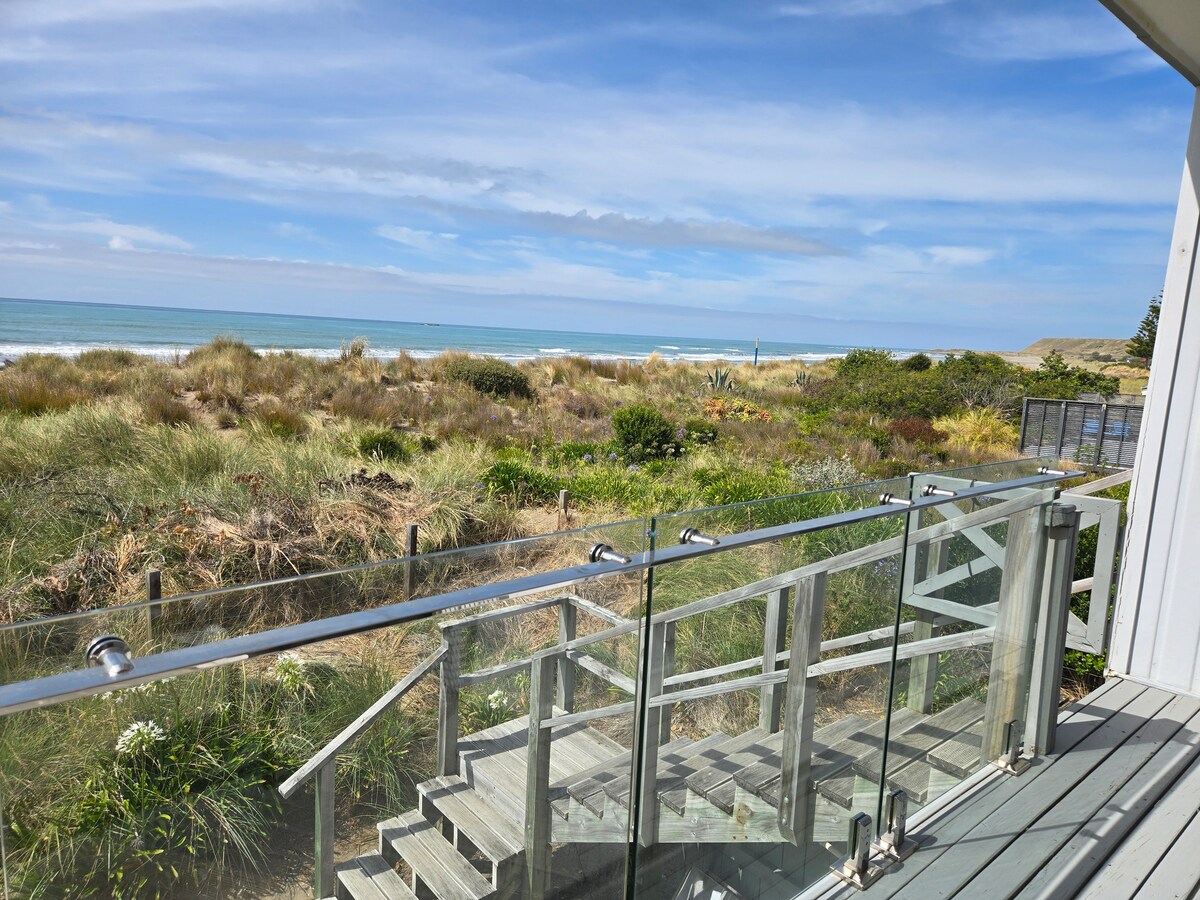 Beliggenhet, beliggenhet, beliggenhet! Denne hytta fra 70-tallet ligger midt i sanddynene, med nydelig utsikt fra øverste etasje. Første inngang er via inngangsdøren, og heisen tar deg til andre etasje. (Det er ingen innvendige trapper.) Dette er en original NZ-bach, og du må ta med dine egne sengetøy og håndklær. Takk. (Jeg kan levere hvis du reiser.) Det er tre soverom, to dobbeltsenger oppe og en queensize-seng, og to barnesenger nede.