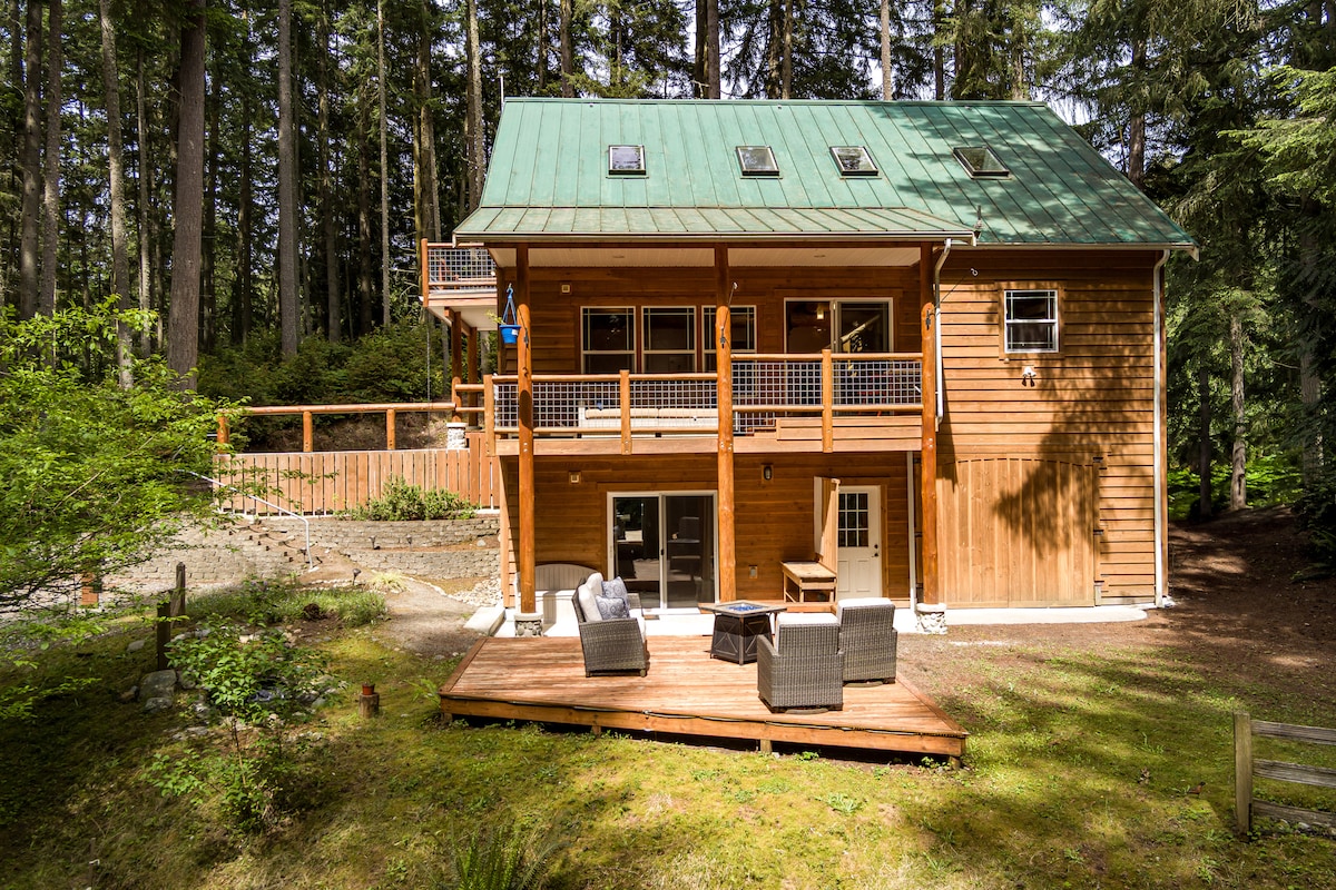 Dette koselige og private minihuset ligger gjemt i en frodig regnskog og er et fredelig tilfluktssted for å senke farten. Våkn opp til fuglesang og lys som filtreres gjennom de høye trærne, nyt kaffe eller vin utendørs på verandaen, grill middag og samles ved bålplassen mens stjernene dukker opp gjennom skogens løvtak. En enkel, gjennomtenkt base for å utforske havnebyene og den olympiske halvøya – eller for å ikke gjøre noe som helst. Det var slik vi planla det. Små kjæledyr er velkomne. Vennligst hør med oss før du bestiller.