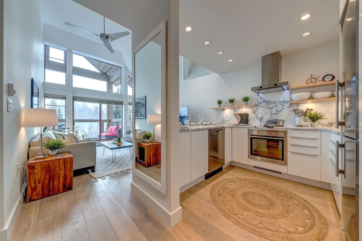 Moderne, lys, ren og koselig. Beliggende rett over alle fasiliteter i Marketplace Pavillion på Main St. En heistur unna alle butikker, dagligvarer, stolheiser og hovedlandsbyen. Bygningen har gratis oppvarmet underjordisk parkering, et felles boblebad på taket i en fullt sikret bygning. I suiten er det vaskemaskin/tørketrommel, peis og fullt utstyrt kjøkken. Badet har badekar/dusj. Suiten er privat og ligger i tredje etasje med fin balkong og vakker utsikt.