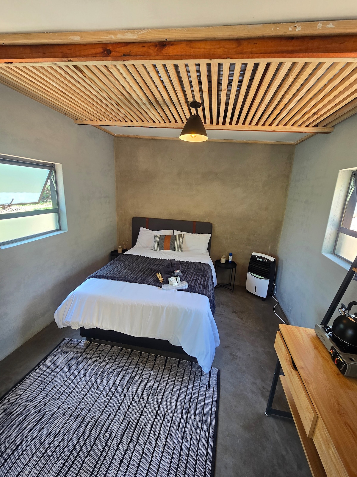 Vi ønsker å invitere deg til denne unike og romantiske opplevelsen i vårt håndbygde Jungle Treehouse laget av gamle skolevinduer. Varmt og trivelig i vintermåneden på grunn av det nylig tilførte varmetepper til queensize-sengen din. Nyt hagen vår og det nybygde evighetsbassenget vårt med fantastisk fjellutsikt og fantastiske solnedganger . Du kan høre fuglene kvitre hele dagen og sovne til lydene av jungelen. Prøv å se uglene og bushbabysene som ofte sitter i jacarandatrærne rundt deg.