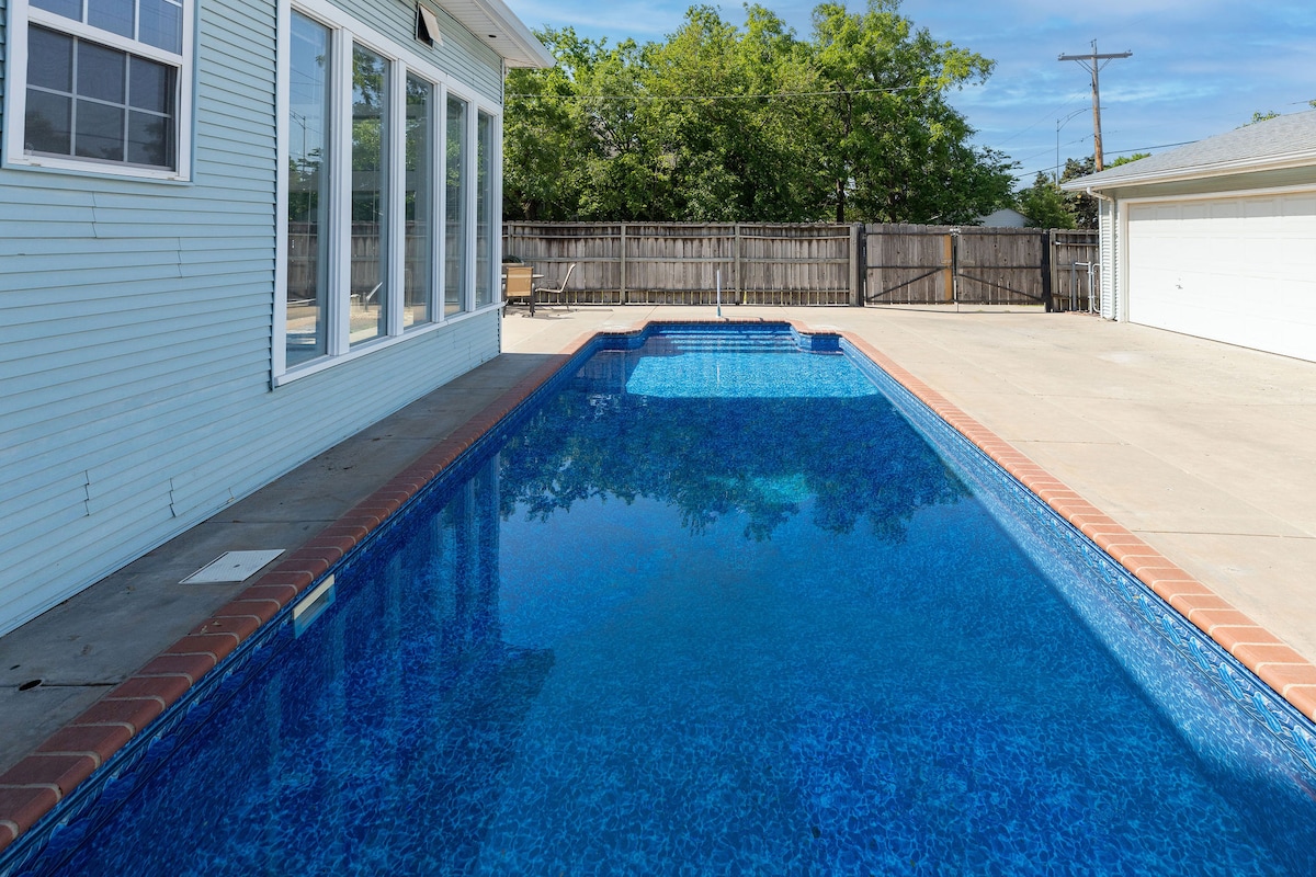 Privat basseng | Prosjektorskjerm og teaterplasser | Koselig peis Drømmeferien i Wichita-området er et klikk unna på denne ferieboligen i Bel Aire. Omtrent 16 km utenfor sentrum av Wichita, gir dette feriestedet med seks soverom og 4,5 bad tilgang til populære attraksjoner for hele familien, som Exploration Place og Kansas International Dragway. Etter eventyrene dine kan du gå tilbake til huset for en dukkert i bassenget, en airhockeyturnering eller den ultimate filmkvelden i visningsrommet!