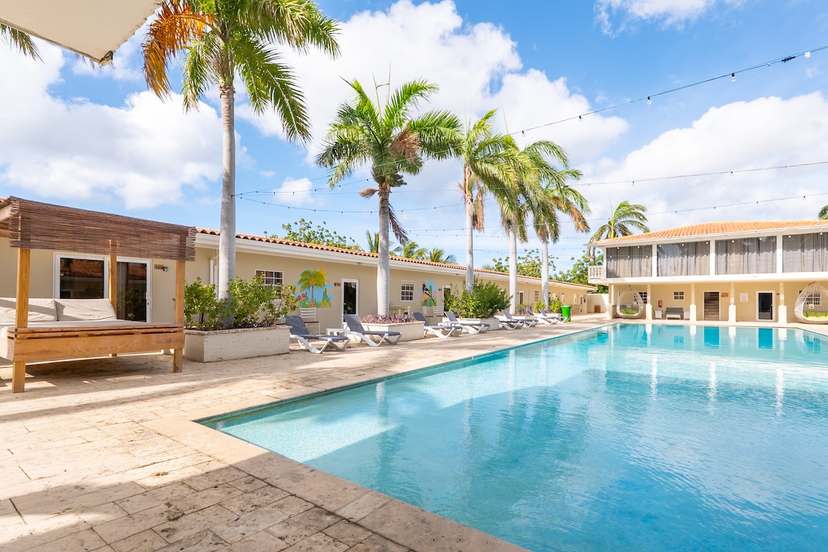 Gå rett til stranden fra denne stilige leiligheten i første etasje på ONE Mambo Beach! Enhet 8 har to elegante soverom, fantastisk utsikt over Karibien og en romslig terrasse som er perfekt for å slappe av i øybrisen. Beliggende i hjertet av Curaçaos mest pulserende område, er du bare noen skritt fra strandbarer, boutique-shopping, topprangerte restauranter og livlig natteliv. ✔ 2 koselige soverom ✔ Fullt utstyrt kjøkken. ✔ Privat terrasse med havutsikt Evighetsbasseng ved✔ havet Se mer nedenfor!