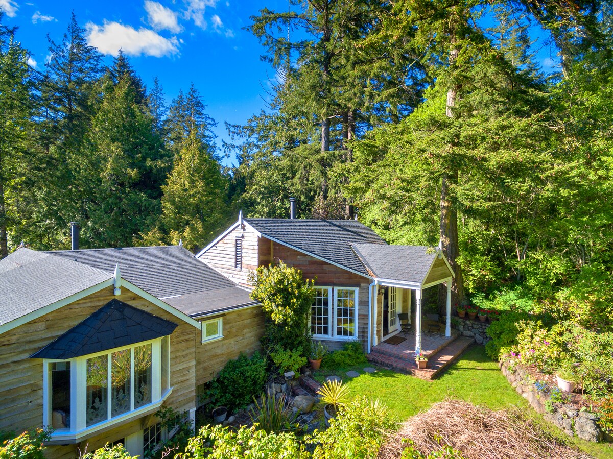 Kanaliser jakten på pause i dette enestående jordhuset. Det koselige tilfluktsstedet ble håndformet ved hjelp av lokale og bærekraftige naturmaterialer, og har en sentral stue med kantbelagte steintrapper som fører til loftsrommet. Gjester har tilgang til hele hytta og den omkringliggende eiendommen. Vi bor i nabohuset og gir deg gjerne råd eller svarer på spørsmål som hjelper deg med å få mest mulig ut av oppholdet ditt. Nabolaget er ganske landlig og for det meste jordbruk med flere gårder og en liten privat vingård. Hjemmet ligger 10 minutters gange fra stranden og 20 minutters gange fra en dagligvarebutikk og delikatesseforretning, som spesialiserer seg på lokale økologiske produkter. Mayne Island har en liten samfunnsbuss. Tider og ruter er begrenset, spesielt om vinteren. Den stopper ved innkjørselen. Vi har også et offisielt liftsystem med signerte bilstopp hvor du kan vente på skyss. Vanligvis trenger du ikke å vente lenge. Vi tilbyr gjerne henting og avlevering ved fergekaien for å oppmuntre til bilfrie reisende, på dager da samfunnsbussen ikke kjører. Gi oss beskjed på forhånd om at du kommer uten din egen transport, og vi sørger for at enten vi eller samfunnsbussen (som setter deg av ved innkjørselen vår) er der for å møte deg når fergen kommer. BC Ferries-terminaler i nærheten av Victoria og Vancouver er lett tilgjengelige via kollektivtransport fra sine respektive flyplasser og sentrum.