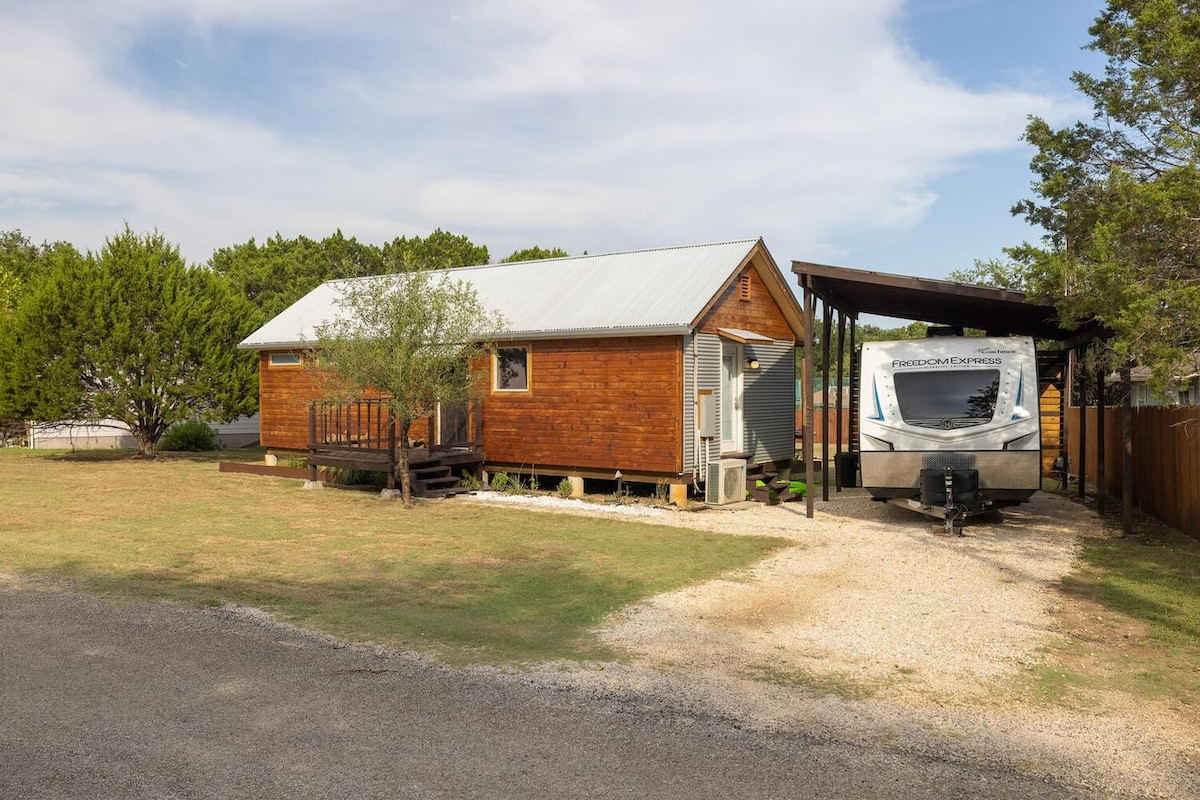 Vårt skogsområde ligger blant gamle eiketrær i Potter's Creek-området, bare fem minutter nord for Canyon Lake. Det er det perfekte helgestedet for å slappe av, koble av og komme tilbake til det som er viktig i livet. Duften av sedertre vil styrke deg, mens de grønne åsene og krystallklare elvene vil rope navnet ditt. Strategisk plassert, vil du være mindre enn en time unna Pedernales, Blanco, Wimberley, Fredericksburg og alt de har å tilby.