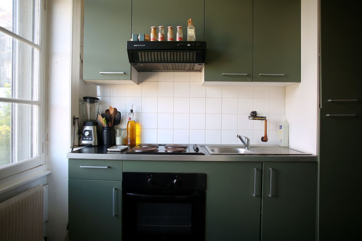66 m2 leilighet, dekorert med kuriositeter, vintage og elementer inspirert av Harry Potter-verdenen ✨ ~> 2 soverom med garderobeskap. Ett av dem med direkte utsikt over basilikaen ~>Et lyst bad, badekar/dusj, dobbelt vask, med håndklær og hårføner, rettetang, hårføner ~> En varm stue med to sofaer, med et stort bibliotek og en falsk peis, et stort spisebord. ~>Komplett kjøkken (kaffe, te tilbys) ~>Overraskelseskurv fra 2 netter.