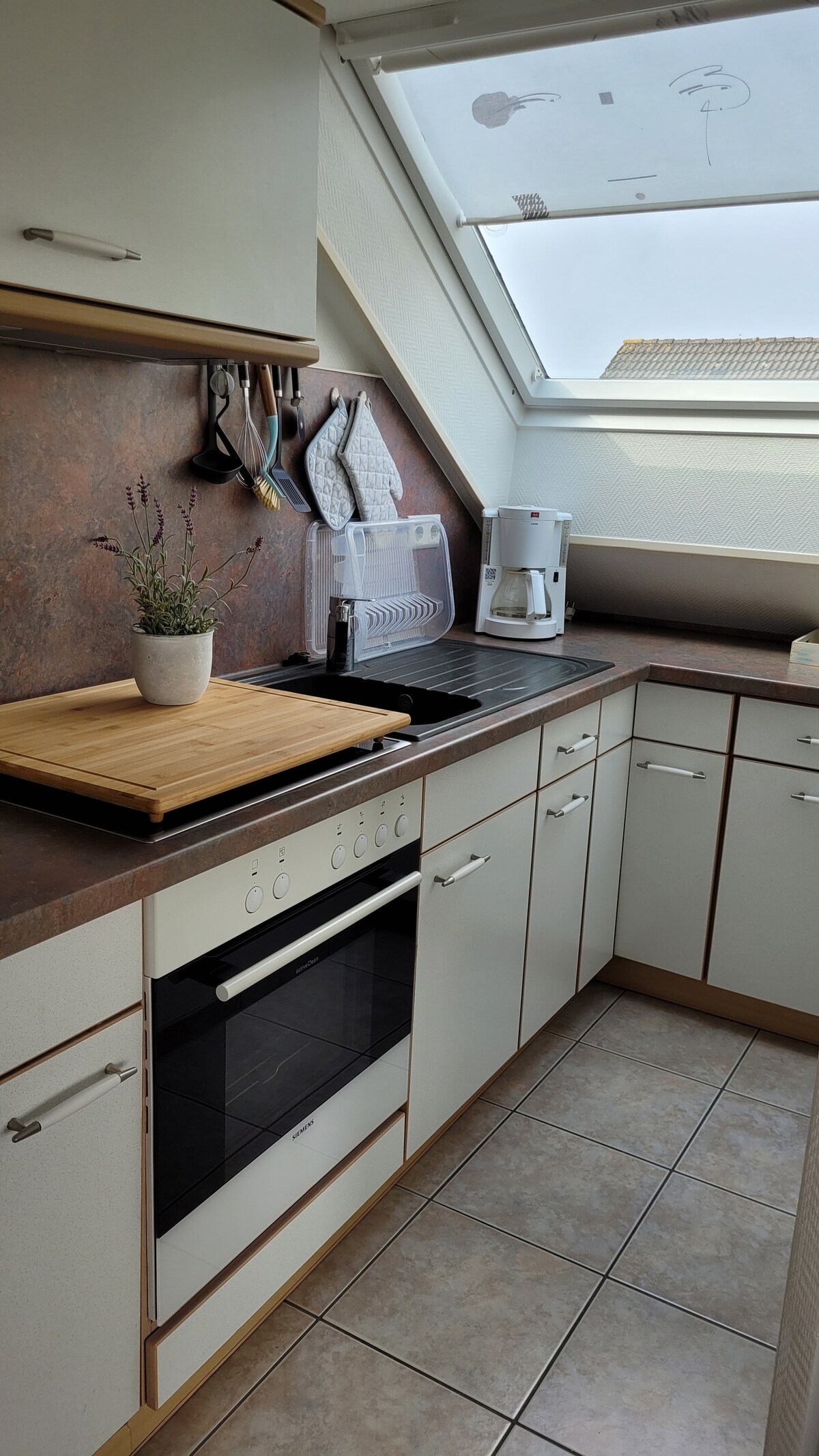 Den ca. 60 m² store loftsleiligheten ligger i et velholdt, fredet byhus i sentrum av Aurich. Gågaten og idrettsanlegg med De Baalje eller havneområdet ligger innenfor gangavstand. Shoppingmuligheter (dagligvarer, apotek) i nærheten. Nærheten til kysten og Tannenhausen-sjøen er perfekt for dagsturer. Leiligheten ble nyoppusset og utstyrt i 2015/2016.