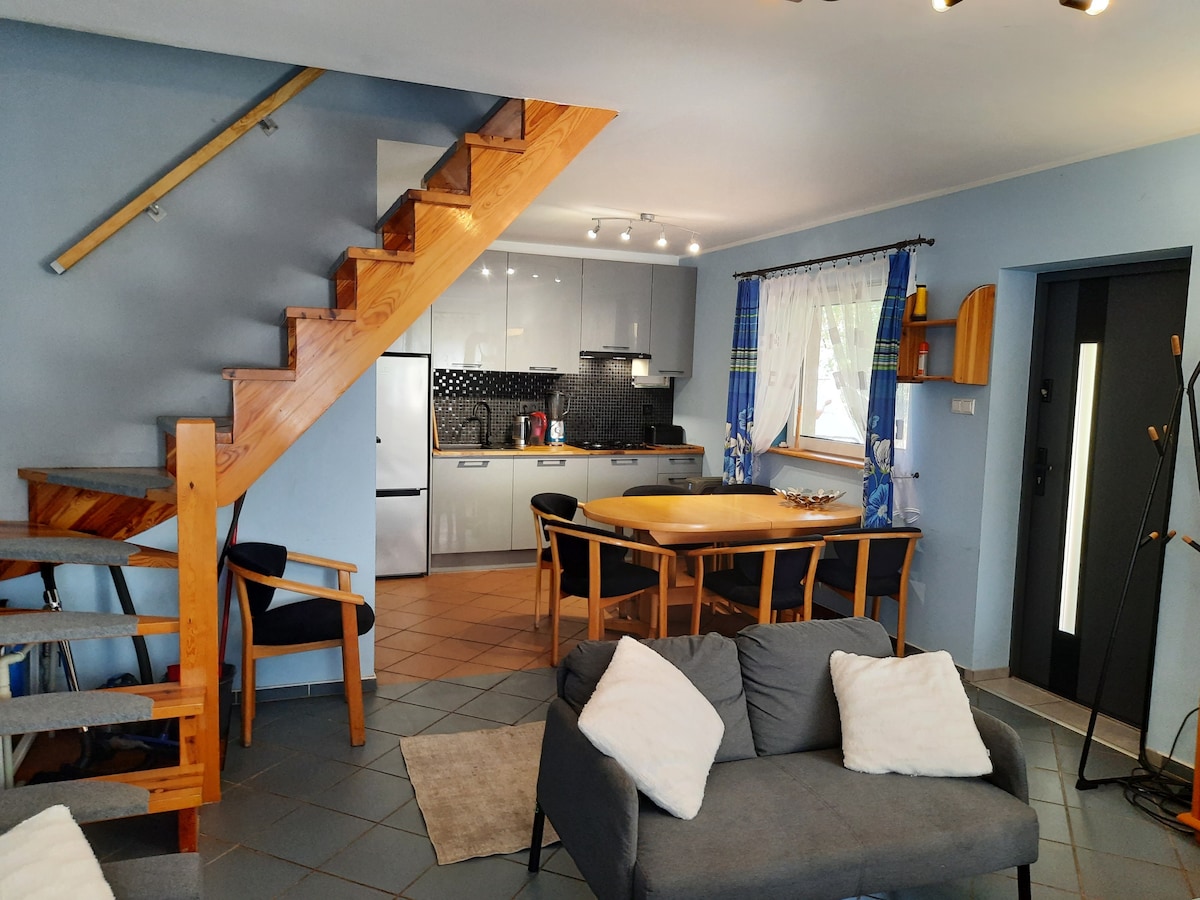 JolieFolie er et unikt sted å slappe av i en idyllisk atmosfære, i nærheten av naturen. Det er det perfekte stedet for intime fester. Vi tilbyr gjestene et hjem omgitt av en hage med bålplass. Interiøret skaper et toetasjes rom. Første etasje på 75 kvadratmeter er: et fullt utstyrt kjøkken med spiseplass, soverom, bad med dusj og en stue. Ovenpå er det en atmosfærisk mesanin - et ideelt sted å slappe av (50 kvadratmeter), med et soverom, bad (badekar). Overnatting for en gruppe på 6-8 personer.