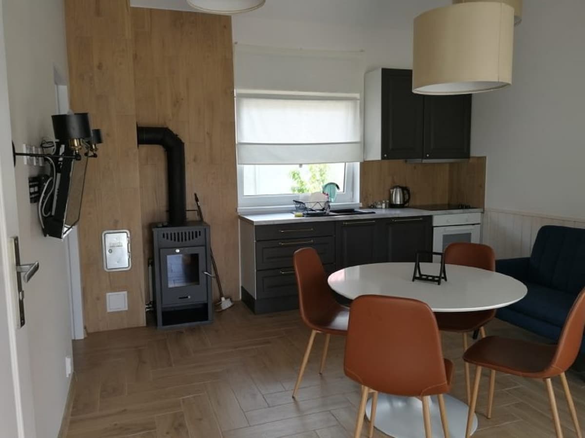 Et feriehus med en sjarmerende beliggenhet ved Lake Dominicki. Komfortabelt møblert, oppvarmet, plassert på en høyde, i utkanten av en furuskog, 300 meter fra en intim sandstrand. Det er en betonggrill i hagen, et rammebasseng (sommersesong), en trampoline for barn. To soverom (2x enkeltseng, én dobbeltseng), stue (hjørne med soveplasser) med kjøkkenkrok, bad, vaskerom. Maks antall personer 6.