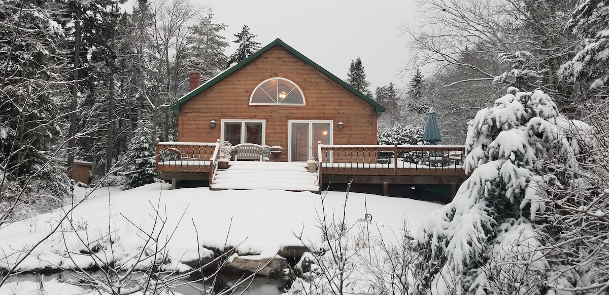 Nydelig tømmerhytte som ligger overfor Woodford-innsjøen med utsikt. Stort flott rom katedraltak, halvmånevindu, furutak og gulv, spisebord,vedovn, hjørne gasspeis, fullt kjøkken. Vakker atmosfære, rustikk, men elegant. To soverom, fullt bad med badekar med løveføtter, romantisk hems med sitteplass. Lekeområde i kjelleren oppvarmet med to senger for barn. Sentralvarme, vaskemaskin/tørketrommel TV/Roku, takvifter. Flott utflukt for naturelskere, skiløpere, snøscootere, turgåere. Wifi.