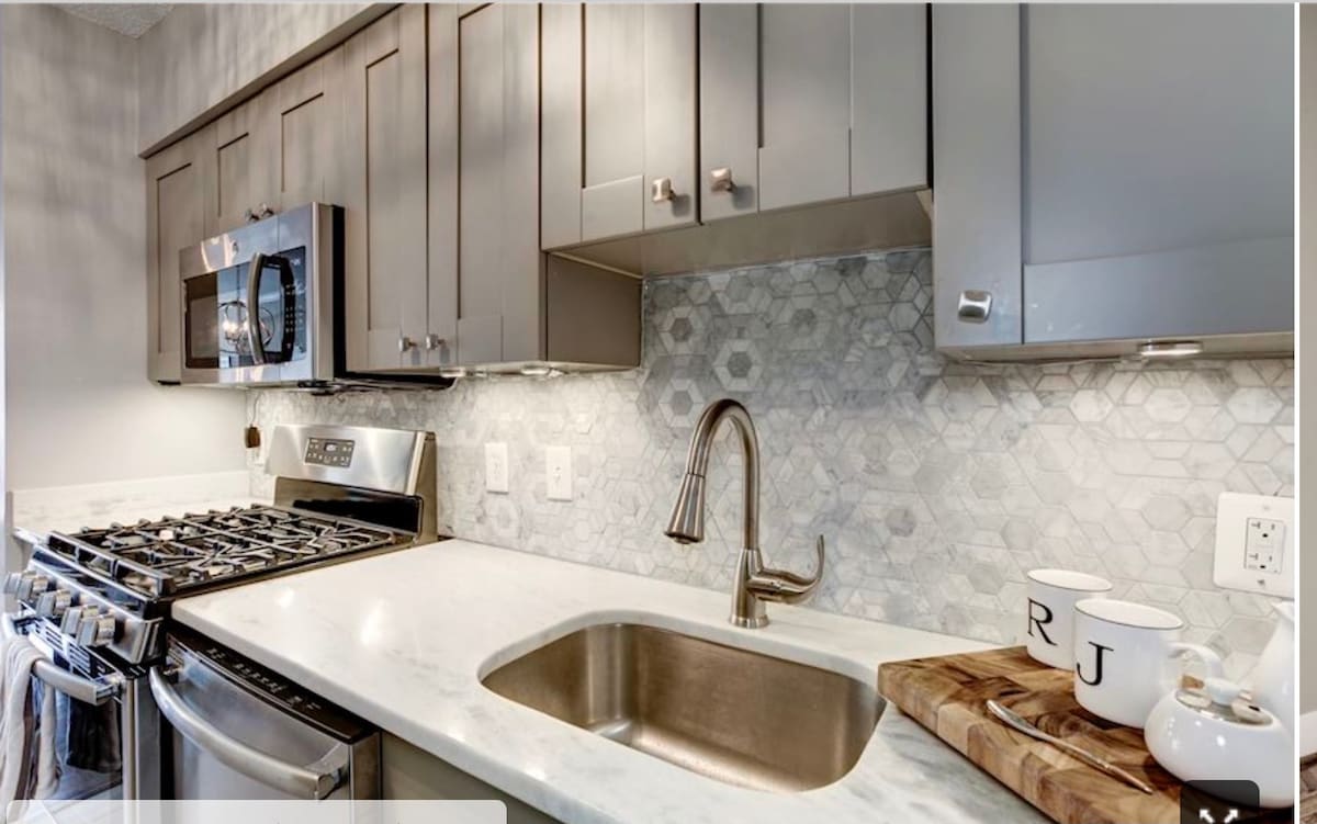 Bare noen skritt fra Baltimores Inner Harbor, Fells Point, Little Italy og John's Hopkins Hospital, har denne fullt utstyrte ettromsleiligheten alt du trenger! Denne moderne og moderne enheten inne i et av Baltimores historiske rekkehus (bygget 1850) har høye tak og vakre vinduer fra gulv til tak. Leiligheten har fullt kjøkken, fullt bad, ett soverom med kontorplass, stue med HD-TV og sovesofa, og en vaskemaskin/tørketrommel i enheten. En sykkel er også tilgjengelig for bruk!