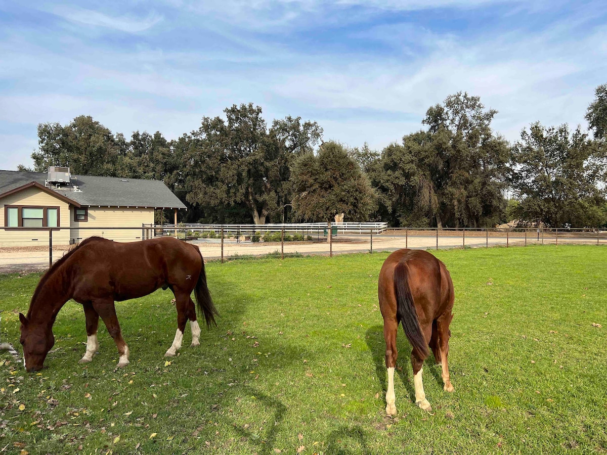 Bo i vårt sjarmerende Bunkhouse med to soverom på en 20 mål stor ranch som ligger ved foten av Sierra Nevada! Funksjonene inkluderer en koselig stue med sofa, TV, trådløst nettverk, Apple TV, skrivebordsområde, kjøkkenkrok (minikjøleskap, kaffetrakter, stekeovn, enkeltbrenner), sentral AC/varme og et bad med dusj. Forvent ranchstemning, arbeidere som kommer og går, og sommer-/høststøv! KJÆLEDYRGEBYR refunderes ikke lenger, da de fleste kjæledyreiere nekter å følge reglene.