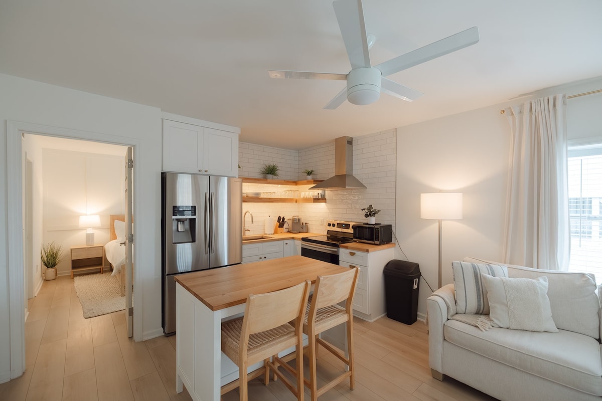 Velkommen til La Ola by Casa Del Sol, en vakkert renovert feriebolig med to soverom, som ligger i en sjarmerende, historisk kvadrupleks som lenge har vært en elsket del av Wrightsville Beach. Denne gjennomtenkte og oppdaterte enheten kombinerer et høytstående design med den avslappede sjarmen ved livet ved kysten, og skaper et varmt og innbydende tilfluktssted bare noen skritt fra både Atlanterhavet og Banks Channel. Enten du planlegger en romantisk helg, en liten familieferie eller et surfefylt eventyr, tilbyr La Ola