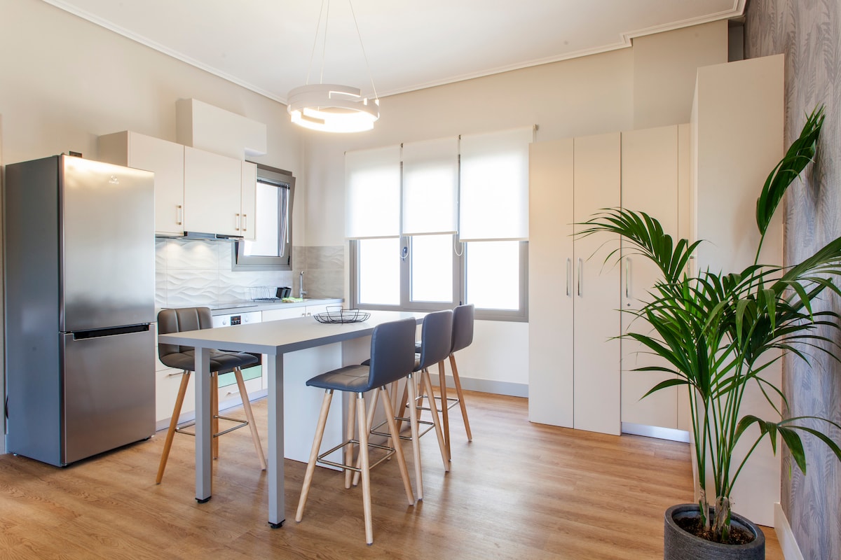 90 kvm elegant og minimal loftsleilighet, renovert i mai 2019, som ligger over Heraklion havn og slott med to private balkonger med utsikt over fantastisk hav- og hageutsikt! To store soverom har kingsize-senger med øko aloe vera-madrasser for dyp søvn! Skjem deg bort på den enorme sofaen som ser på Netflix på 58 tommer TV. Kjøkkenet er fullt utstyrt med moderne induksjon og stekeovn!Vaske- og tørkemaskin for dine bekvemmeligheter! Badet er absolutt minimalistisk og romslig!Eco-Inverter Klima og gratis parkering!