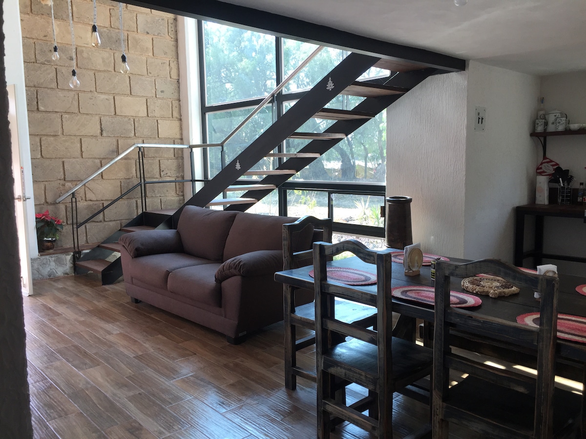 Vakkert og komfortabelt loft 10 minutter fra AIFA, en halvtime fra pyramidene i Teotihuacán. Ideelt for å slappe av hvis du reiser på jobb eller også med familien. Vi ligger svært nær den ikoniske Casco de la Hacienda de Ojo de Agua, på en eksklusiv og svært rolig beliggenhet. Kjøpesentre, Mexibus-stasjoner, butikker, restauranter/barer osv. ligger innenfor en radius på 10 minutter. Vi har parkering for to kjøretøy.