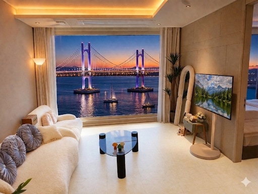 Dette er Rose Stay ~ Dream Ace Gwangan er en sensasjonell overnatting hvor panoramautsikten mot Gwangan-broen og den vakre nattutsikten vil helbrede deg. Den følelsesmessige stuen, som kombinerer en koselig sofa med et buet design og et minibord, har havutsikt over Gwangan-broen og sjøen gjennom vinduet, noe som gjør det til et perfekt sted å slappe av og ha en romantisk tid. På TV-en og stråleprojektoren kan du nyte en rekke stemningsfulle spillelister og videoinnhold for å gjøre turen mer komfortabel. Blått hav og vakker utsikt om natten. Vi lover en spesiell dag i Dream Ace Gwangan, et emosjonelt hvilested med et komfortabelt interiør og en fantastisk panoramautsikt over havet. Nyt havutsikten, byutsikten og utsikten over Gwangan-broen, hvor du kan beundre ~ ~