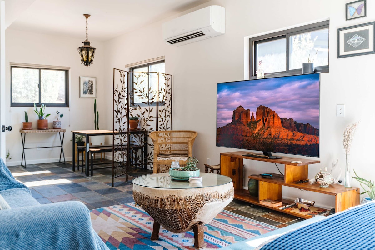 Nyt Sedona fra den lyse, innbydende studioleiligheten vår. Ideelt beliggende, vandre til butikker, kaféer og gallerier, og slapp av i et fredelig, privat tilfluktssted. En perfekt base for å utforske røde klipper, naturskjønne stier og de sjarmerende byene i det nordlige Arizona. Den er gjennomtenkt designet for komfort, har plass til to gjester og inkluderer en queensize-seng, fullt kjøkken, bad med dusj, vaskemaskin/tørketrommel og kaffe/te. Gjester gir oss konsekvent fem stjerner for beliggenhet, renhold og gjennomtenkte detaljer!
