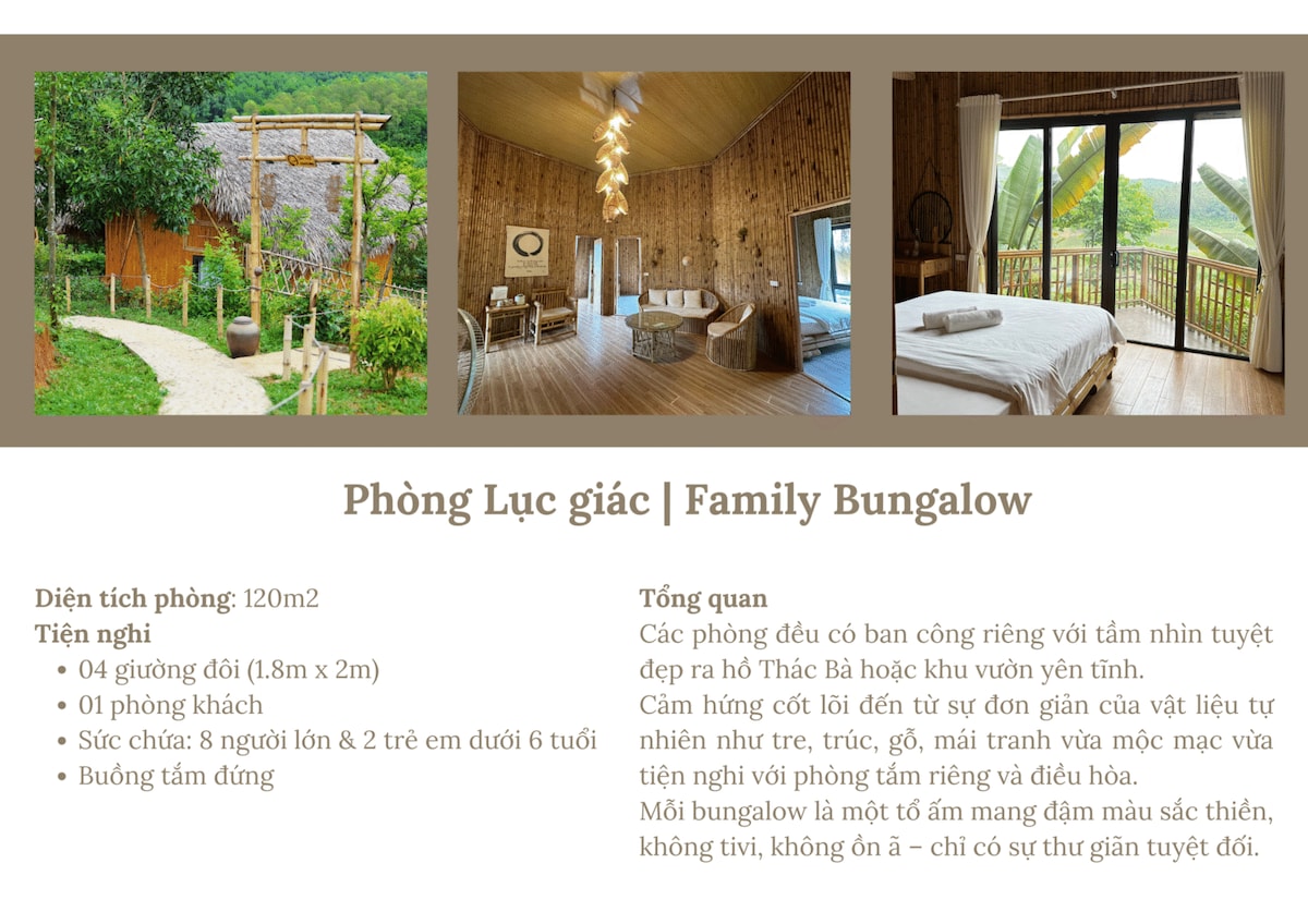 Chỉ 10 bungalow view hồ – nơi mỗi phòng là một góc an yên dành riêng cho bạn. Om Tara vẫn luôn ở đây chờ đón bạn bằng sự tĩnh lặng dịu dàng nhất.Inbox ngay để Om cùng bạn lên lịch cho những ngày thật yên bên hồ Thác Bà.