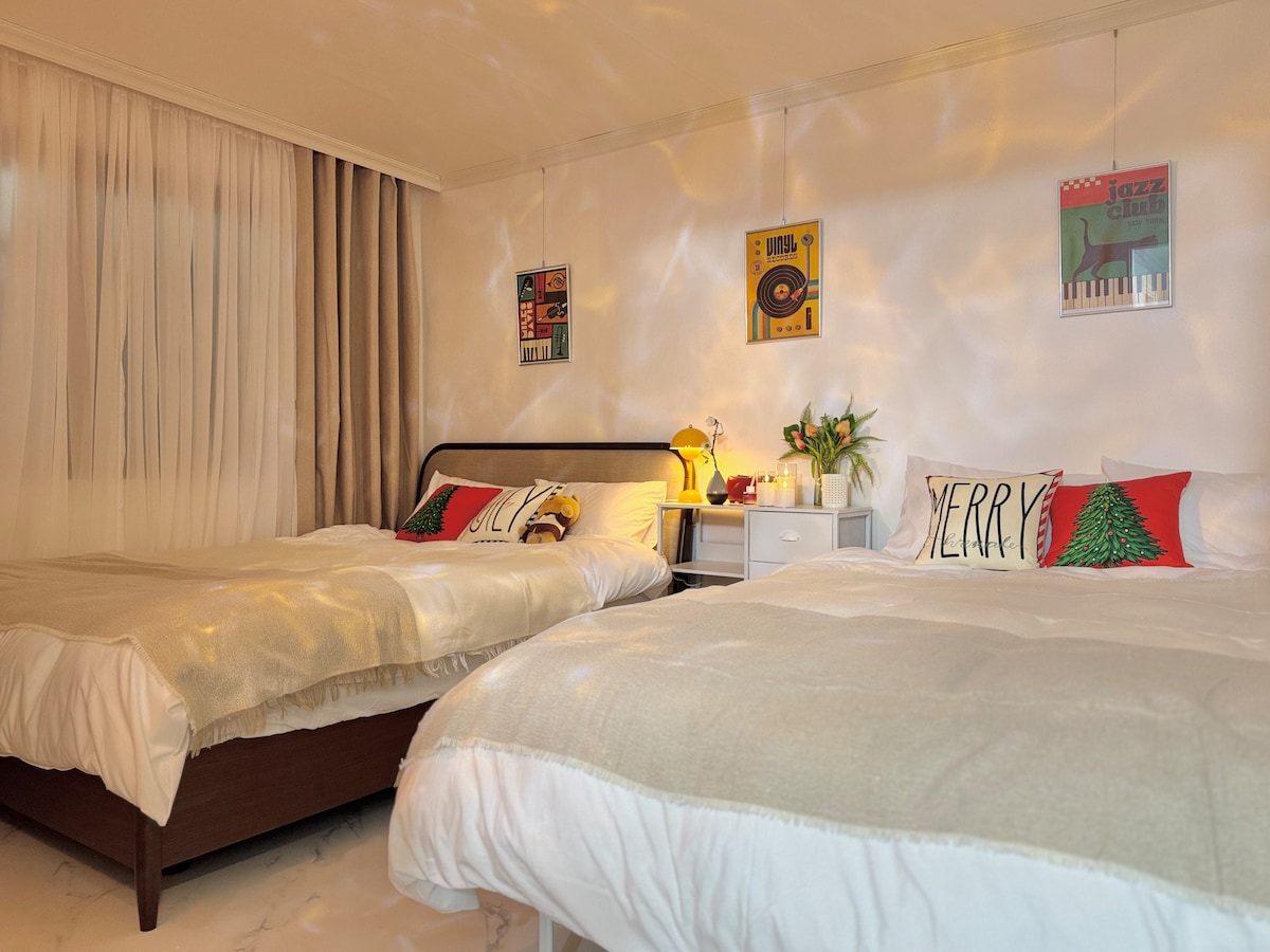 - Plassert i sentrum av Yeongjongdo, ideelt for reiser til Incheon International Airport, Yeongjongdo, Muiso, Shindo, etc. - 7 minutters gange fra utgang 2 på Unseo Station (destinasjonen nedenfor er basert på Unseo Station) - Incheon lufthavn terminal 1: 2 stasjoner 7 minutter - Incheon lufthavn terminal 2: 3 stasjoner 14 minutter - Kimpo flyplass: 5 stasjoner 29 minutter - Hongik University: 8 stasjoner 44 minutter - Seoul Station: 10 stasjoner 52 minutter - Det er et nytt kjøpesenter og boliger, 60 pyeong, hele tredje etasje, romslig og rent - 120-tommers stråleprojektor for Netflix, YouTube, personlig video og presentasjoner - En stor heis for 15 personer er installert, slik at den er lett tilgjengelig for eldre og andre som har problemer med å bevege seg - Privatlivet er beskyttet med individuelle dusjer i hver stue og hvert rom - Hvert rom er like stort som et vanlig hjem, og det er installert et system med aircondition, noe som gir et romslig og moderne rom. - Grill mulig på taket (valgfritt) - For 2, 30 personer, vennligst kontakt oss