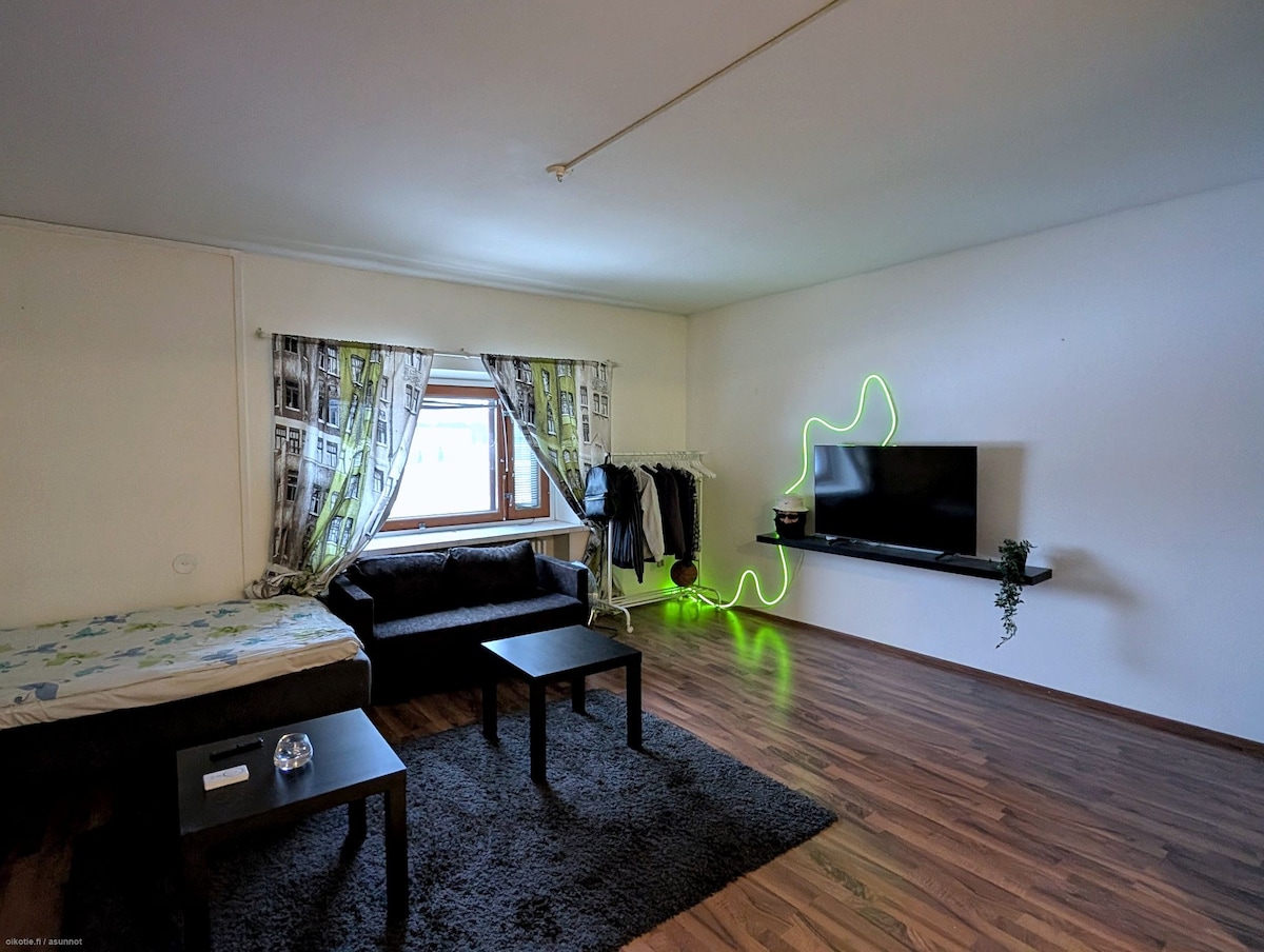 Kultur, trening og diner fra dørstokken, i sentrum. Hva ønsker du å gjøre i dag? *Kirke 400 m. * Kultursenter 400 meter (under oppussing). * Olvi Hall og det fantastiske bryggerimuseet (inngangsbillett € 0 forresten) 440 meter *Market Square 130 meter. *kjøpesenter 30 meter *skiløyper 160 meter *Luuniemi Event Area (Oluset, Runni Rock) 240 meter *tennisbaner 1000 meter *minigolf 460 meter *pub 300 meter til *strand 250 meter * Treningssted i nærheten 250 meter. * Treningsstudio døgnet rundt 400 meter. Stuen deles med en mellomliggende gardin om nødvendig, to som sitt eget sted.