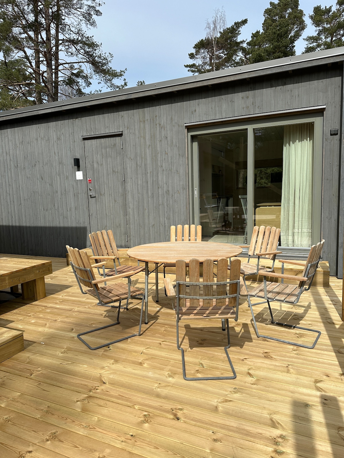 Nå leier vi ut Attefallhus "Lillstugan" som ligger på eiendommen vår blant furutrær og sjøstøy. Hytta ble bygget i 2021. Den ligger kun ca. 150 meter fra havet og en fantastisk strand. Restaurant 1135 ligger innenfor gangavstand, og om sommeren er det minigolf og tennisbaner i nærheten.