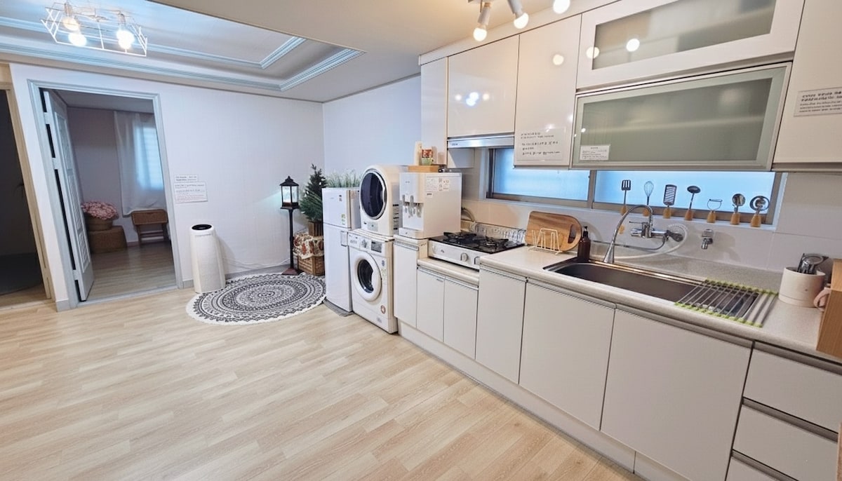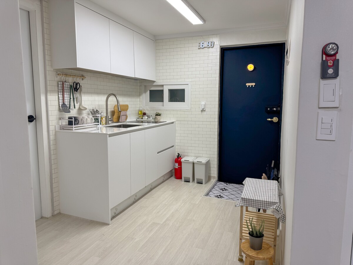 Hei, dette er et sted som ligger på baksiden av Cheils plan mellom Itaewon stasjon og Hangangjin stasjon i Seoul. Det ligger en 5-minutters spasertur fra Itaewon stasjon og en 10-minutters spasertur fra Hangangjin stasjon, og bekvemmelighetsfasiliteter som nærbutikker og kafeer ligger i nærheten. Huset ligger i et boligområde og er veldig rolig. Det er derfor en fest eller samling som ser ut til å føre til at mye støy ikke passer bra. Stedet har en liten stue, to rom og et bad. Det er to, men opptil fire. Det er også mulig. Av hensyn til et hyggelig miljø og sikkerhetsgrunner er det også at bare gjestene som har bestilt er tillatt i. Vær oppmerksom på at hvis du ødelegger dette, kan du bli fjernet. Soverommet har én queensize-seng og Fra 3 personer vil sengetøy bli gitt ved forespørsel. På kjøkkenet, grunnleggende bestikksett, gryter, panner osv. Det er utstyrt med en mikrobølgeovn, en kaffemaskin, en kaffekanne og et lite bord og spisebord. Badet har sjampo, balsam, dusj og tørketrommel. Trådløst nettverk er tilgjengelig, og vi har en 50-tommers smart-TV. Parkering - bruk av offentlig parkeringsplass i nærheten