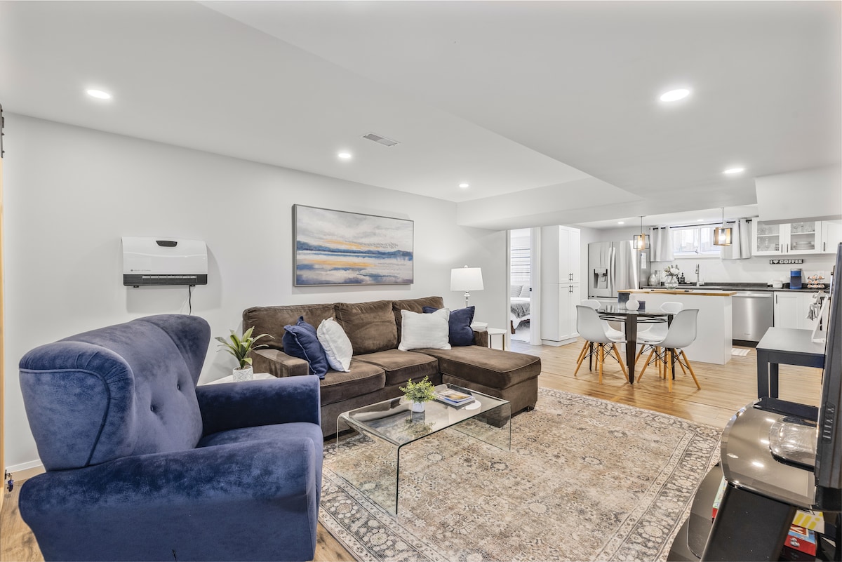 Kjelleren vår med privat inngang med tastatur i Torontos West End med trær på begge sider av gaten er ideell for turister eller folk som kommer til byen for å jobbe. Den ble totalrenovert tidlig i 2025 med en 1950-talls vintage reisevibe du vil elske. Helt nytt bad, fullt separat soverom med queen size-seng (ENDY-madrass), TV, skrivebord, pluss stue med peis og sovesofa. Det er også en kjøkkenkrok/vaskerom. Tre minutters gange til Jane T-bane. Tak 6'5" med 1 nedre bjelke. Vi bor ovenpå – enheten er støydempet.