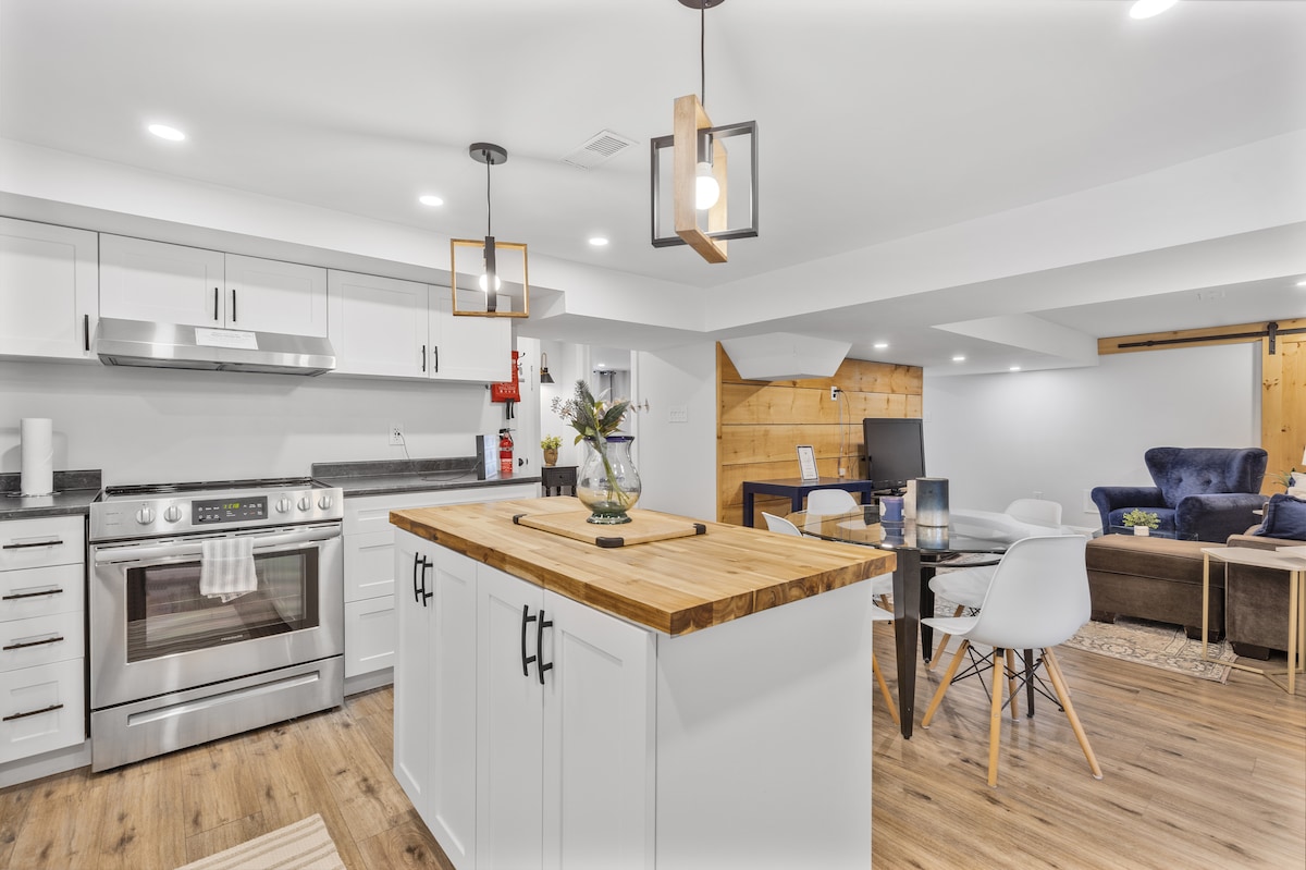 Fra den eksponerte mursteinen, til originale kunstverk, til et massivt privat bad med dobbelt vask, har denne kjellersuiten i hjemmet vårt blitt renovert og innredet for å føles som et loft. Dobbeltsengen er helt ny med en 16 tommers madrass som garantert gir en utmerket natts søvn. Du finner en helt ny, 42" smart-TV som hviler på en unik peishylle omformet fra et antikt oppreist piano, samt et kjøkken med konveksjonsovn/luftfrityr, Keurig kaffemaskin og minikjøleskap i rustfritt stål.
