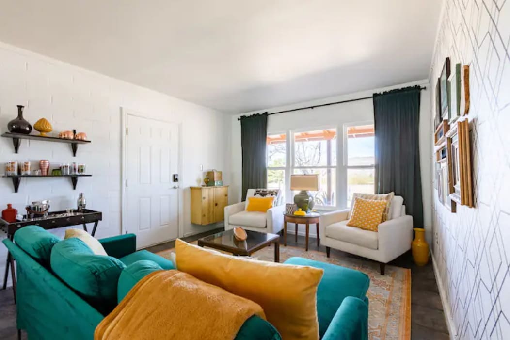 The Rum Runner. En moderne vri på den klassiske ørkenhjemmebonden. Høydepunktene inkluderer: – boblebad – grill – Tesla-lader. – flere bålplasser – Sengetøy fra Parachute – lydanlegg fra Sonos – uendelig utsikt mot ørkenen – flere cowboybadekar – fullt utstyrt kjøkken – utendørs seng for stjernetitting – stor skyggefull terrasse med utendørs spisestue – solrom med 8 x 20' uttrekkbar glassvegg – innendørs veggmaleri designet av den lokale kunstneren Ana Digiallonardo