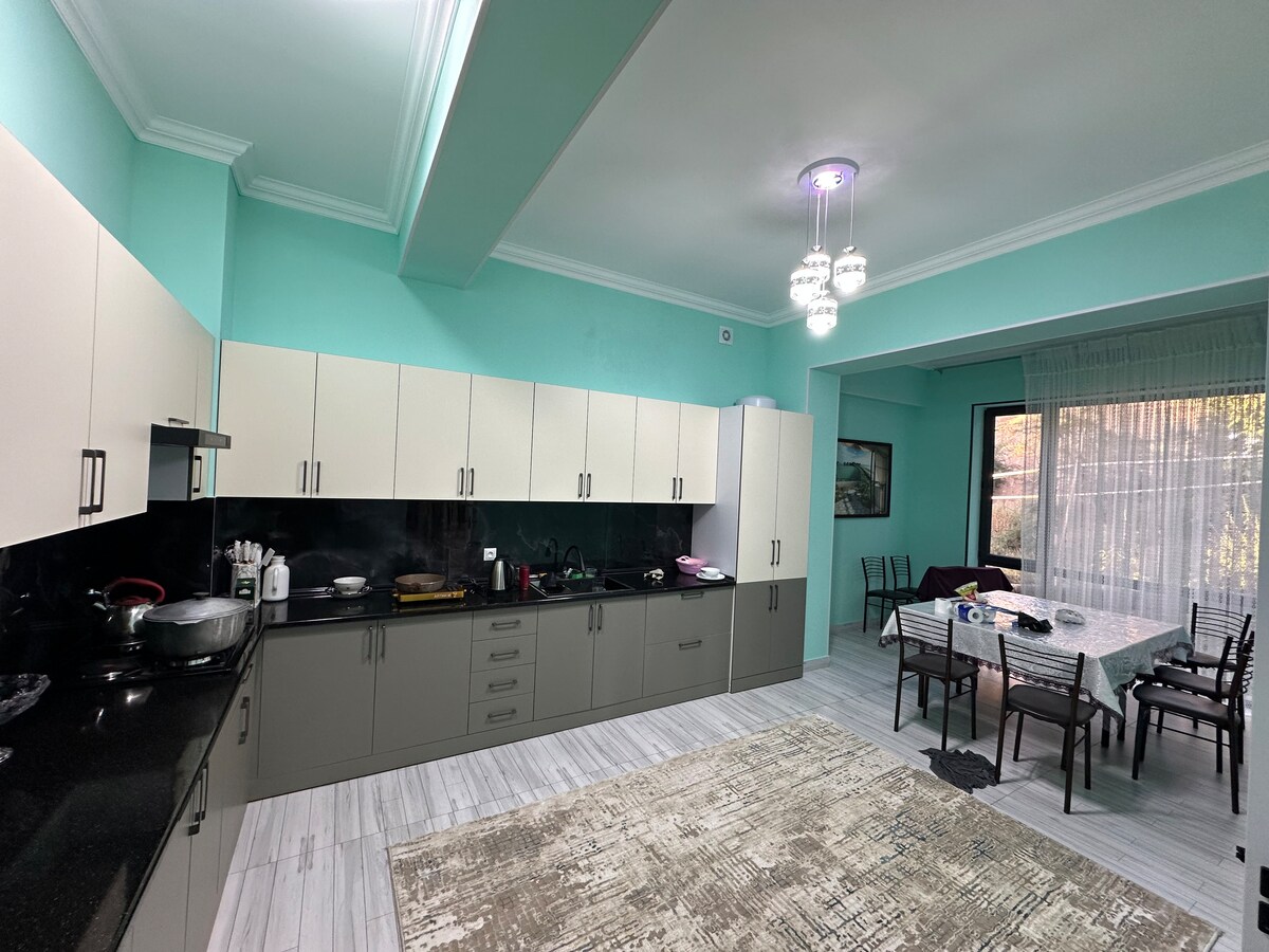 Slapp av med hele familien i denne rolige, rolige feriestedet med panoramautsikt over fjellene rett over sentrum av Chimgan. Dacha har et åpent uteområde med vedfyrt komfyr, grillstativ, innendørs og utendørs kjøkken, og en hage med eple- og pæretrær. Inne har Dacha nok plass til en stor gruppe eller familie på opptil syv personer.
