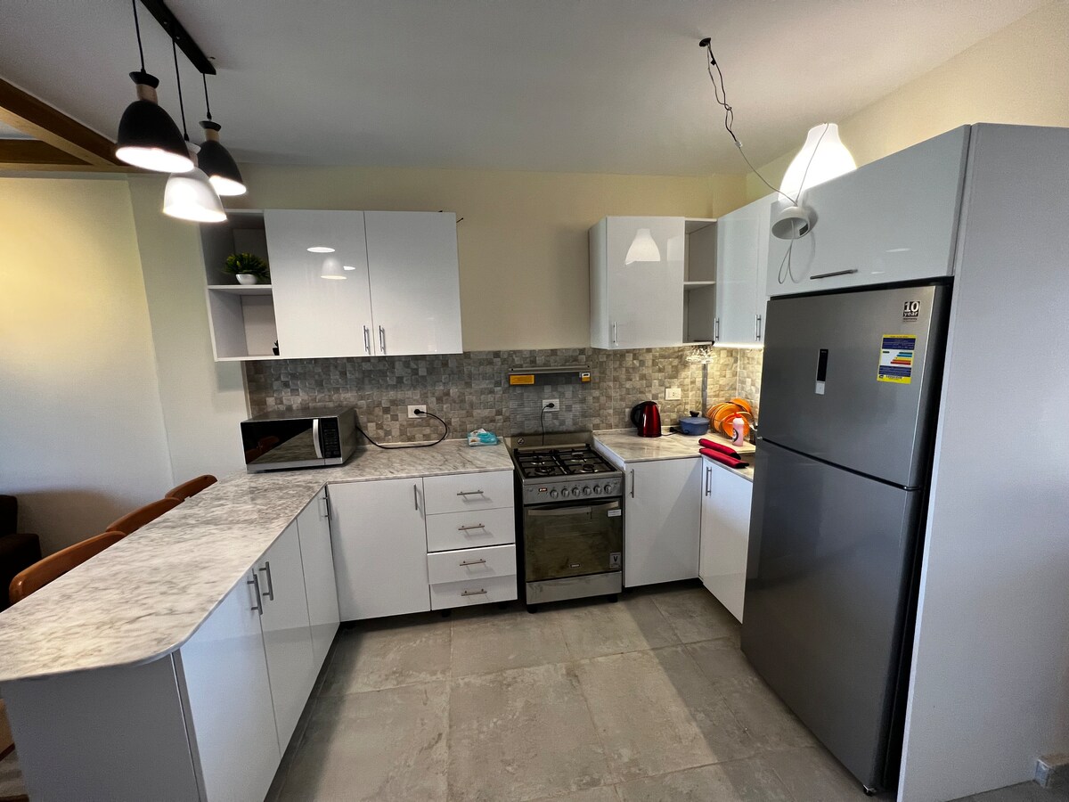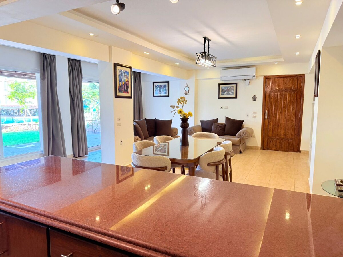 Unn deg luksus i Mountain View Sokhna – bare én time fra Kairo! Denne stilige hytta med to soverom har en privat balkong med fantastisk bassengutsikt, et koselig oppholdsrom, raskt trådløst nettverk og et fullt utstyrt kjøkken. Nyt bading året rundt med tilgang til et oppvarmet basseng og en privat strand. Det ligger i et inngjerdet feriested med sikkerhet døgnet rundt, og er perfekt for å slappe av eller utforske populære steder i nærheten. Bestill ferien din nå – komfort, sol og stil venter! Ingen blandede grupper.