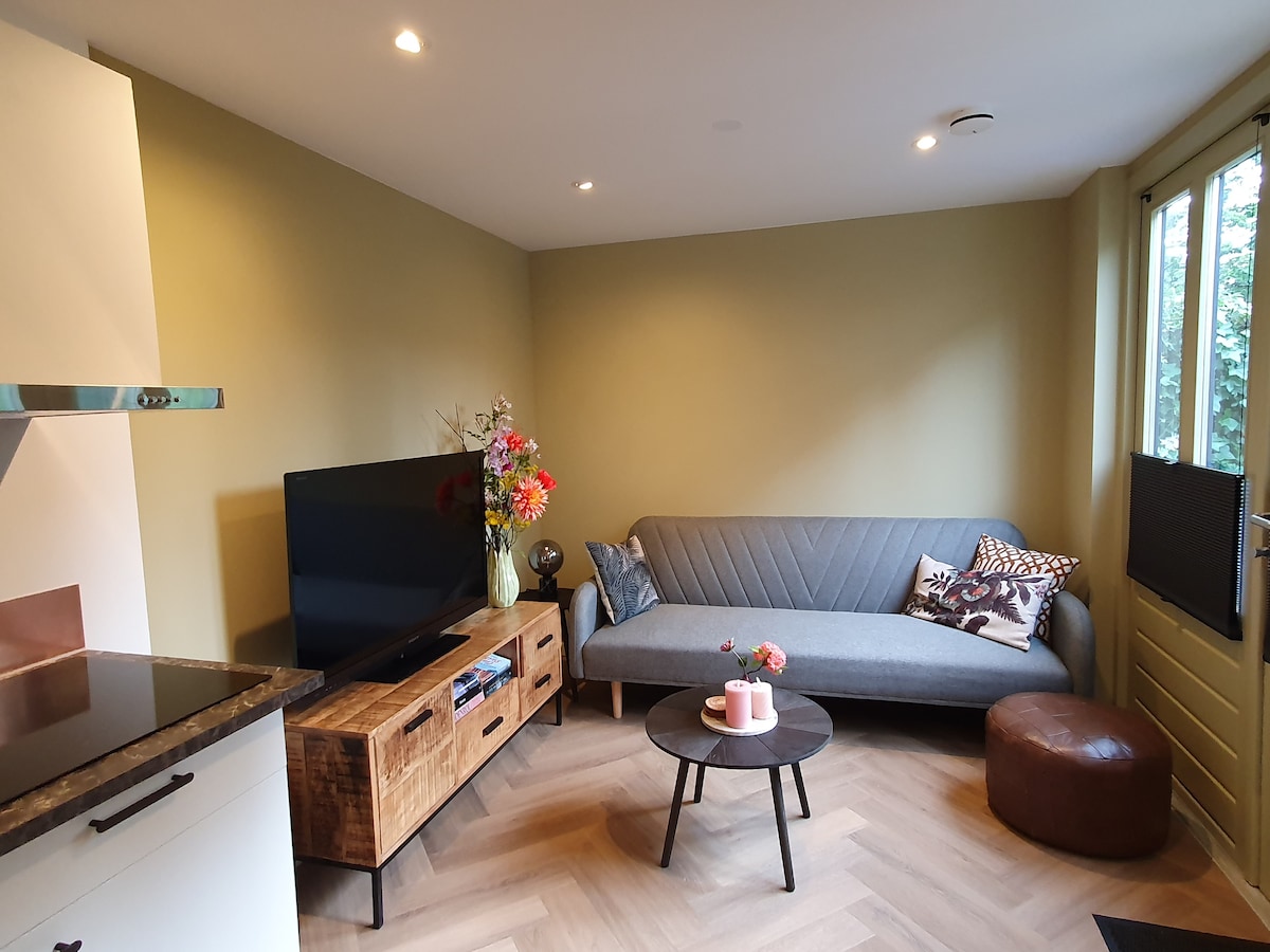 Een licht en knus gastenverblijf in een rustige, groene omgeving. Dorp en winkels op loopafstand (800m) en strand op rijafstand. De perfecte plek om te ontspannen en de omgeving te ontdekken. LET OP. De slaapkamer bevindt zich op zolder en de plafond is op de hoogste punt 1,80m. Er is dus niet veel beweegruimte in de kamer. Beneden is een kledingkast. De kitchenette heeft een combi oven, koelkast en een kookplaat. Airfryer beschikbaar op verzoek. Bushalte op 400 m, trein station 1,3km.