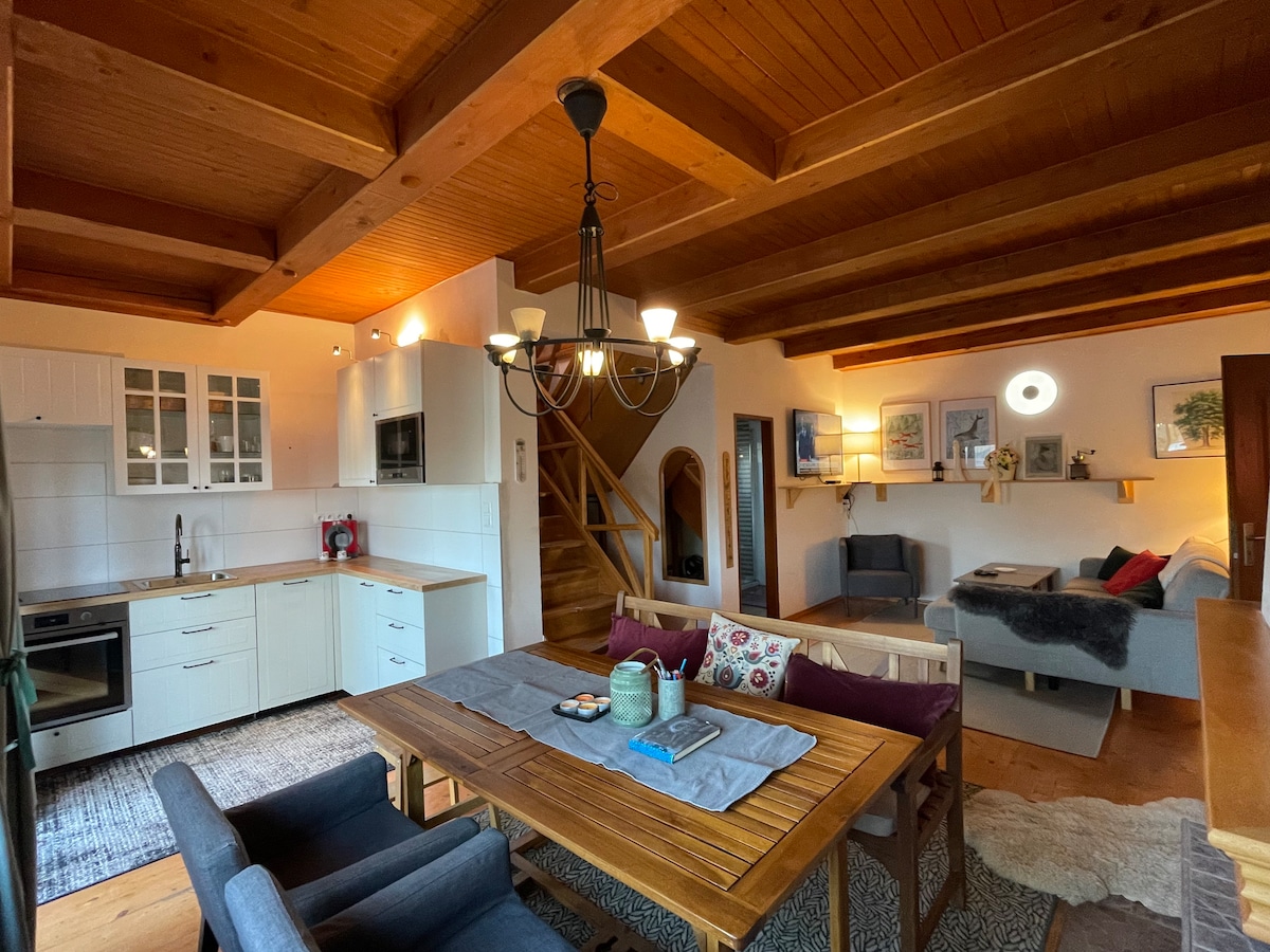 Leilighet hvor historien møter det 21. århundre. Omtrent 80 år gammelt hus gjenoppbygd for moderne livsstil med bevart original vegg laget av steiner. Beliggenheten tilbyr to innsjøer i nærheten, ruiner av slott og vakre turstier. Vinproduksjon i bygda har en tradisjon på mer enn 200 år. Etter avtale med verten kan du bli enige om vinkjellerutflukt med vinsmaking.