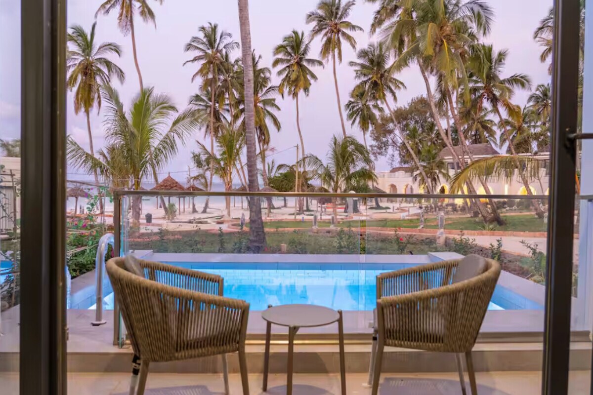 Privat suite med to soverom, stue, bar, omfattende utendørsområder og privat strandbasseng. Suiten ligger i første etasje i en villa i to etasjer. Noen minutter sør for Jambiani er denne leiligheten fullt betjent av et dedikert team med en privat kokk og gjesteleder for å gjøre oppholdet ditt eksepsjonelt. Selv om du er utenfor landsbyen, sørger vi for at du ikke går glipp av noe med utrolig mat, drikke, taxier, utflukter, felles yogaplattform og enkelt treningsstudio.