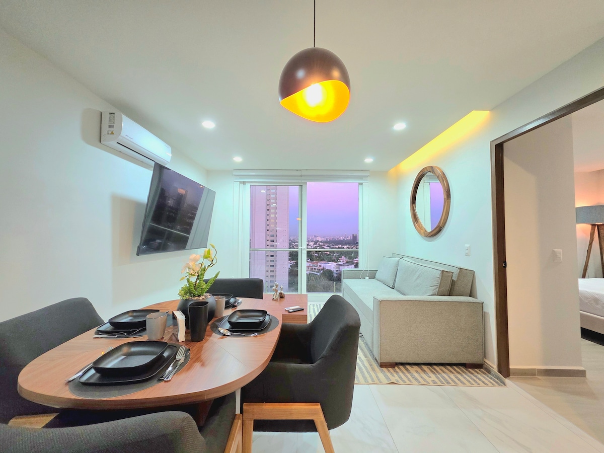 Komfortabel leilighet, 14. etasje, klimaanlegg, varmt basseng, lekeplass, kontorfellesskap, tak med flott utsikt. Nær: Telmex Auditorium, Benito Juárez Auditorium, Guadalajara Arena, Santander Complex, Pan American Baseball Stadium, Jalisco Stadium, Zoo, Selva Mágica, Dermatological, CUCEA. God forbindelse til offentlig transport, bybane, makroperiferi, samt viktige veier. Om noen minutter kan du være i sentrum av Guadalajara, basilikaen i Zapopan eller Tonalá.