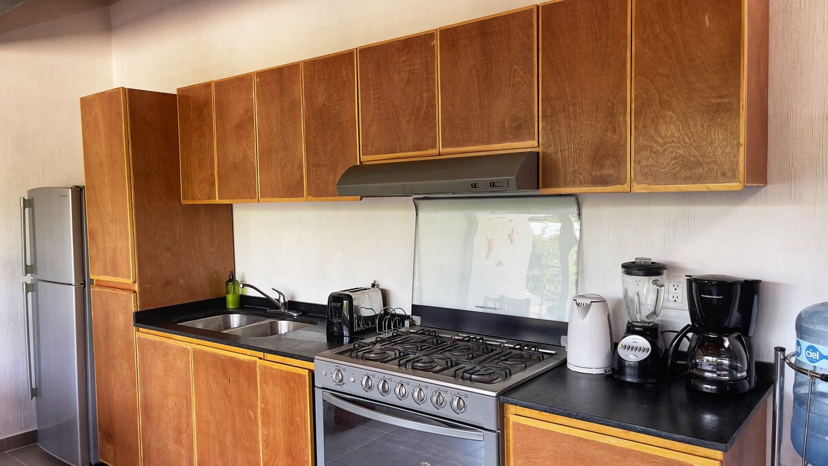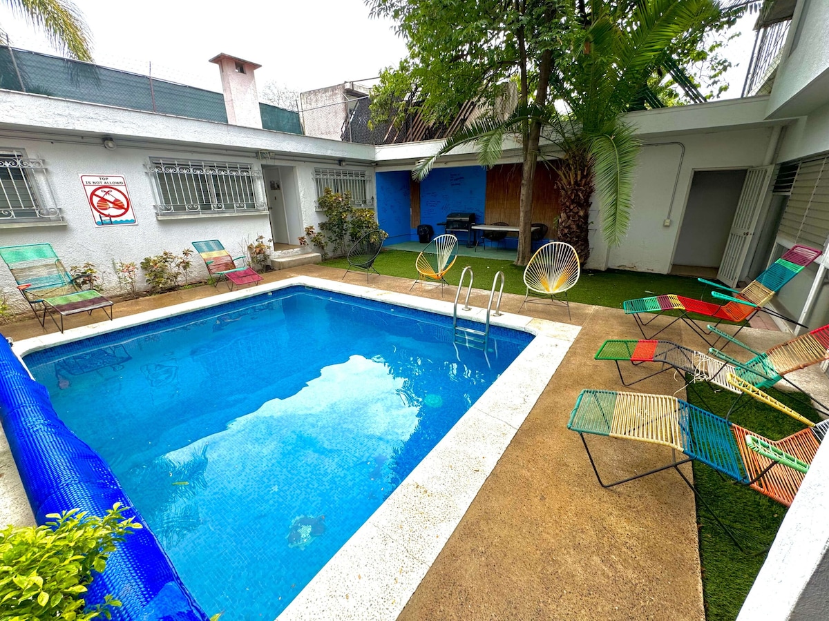 Livsstilsalternativet på Las Sabilas Guesthouse, denne lyse leiligheten har franske dører som åpnes til en nabolagsgate, et eget kjøkken og rikelig plass til to eller tre personer. Passer til Netflix og slapp av, ettermiddagslur etter en svømmetur i bassenget, eller et spontant middagsselskap med dine nye Guadalajara-venner. Vi er homofile og imøtekommende. Vi har andre rom på www.airbnb.com/p/lassabilas