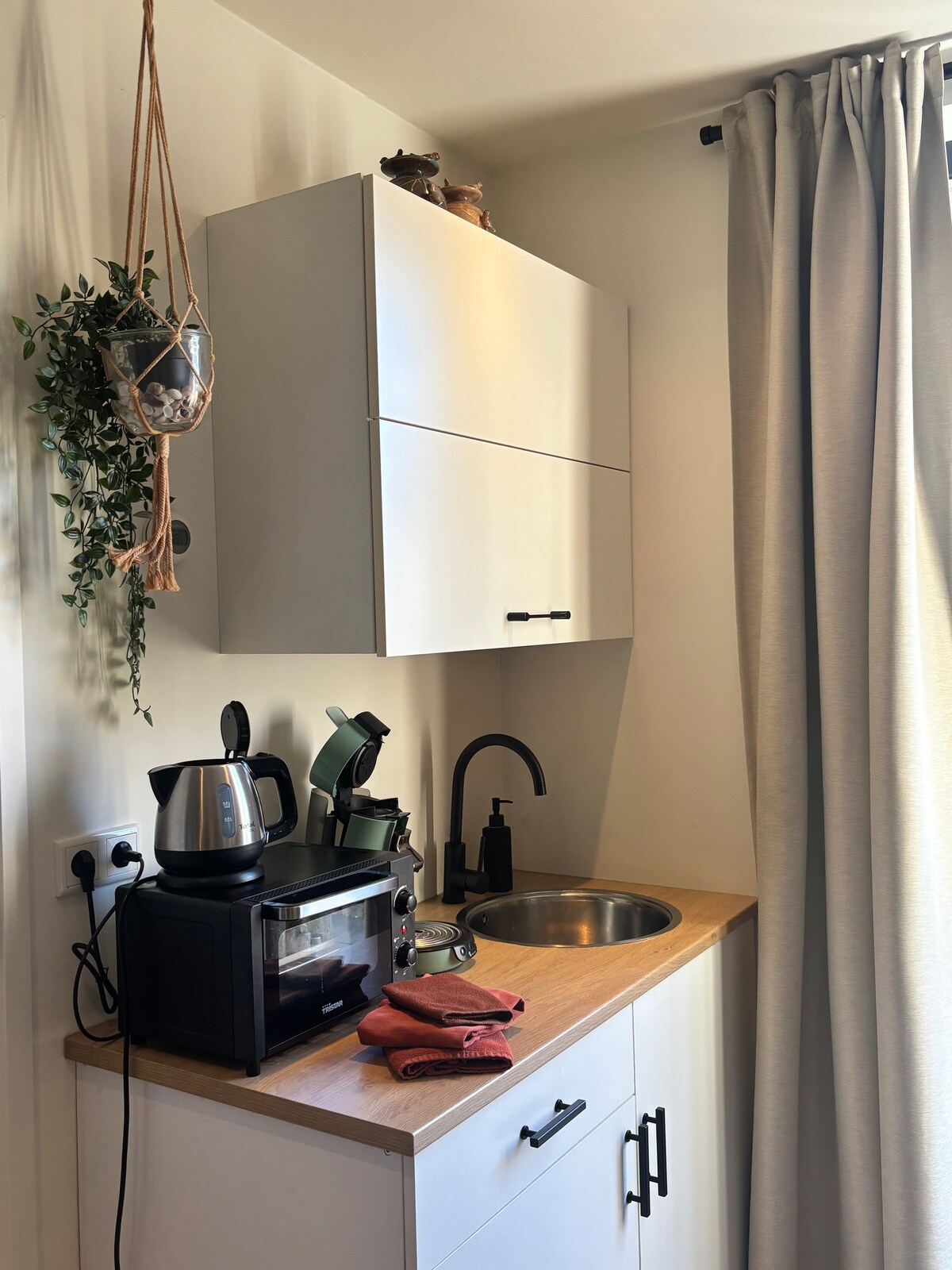 Denne sjarmerende eiendommen har en stilig innredning. Utstyrt med alle slags bekvemmeligheter! Lage du deg selv eller lage din egen frokost? Du kan gjøre det på ditt eget kjøkken. Foretrekker du frokost? Vi kan tilberede den for deg ( € 12,50 p.p.) En egen inngang, et privat bad, et privat kjøkken, en sovesofa (tredje pers), et sete og en spiseplass. Så dere kan holde dere alene i studioet vårt.