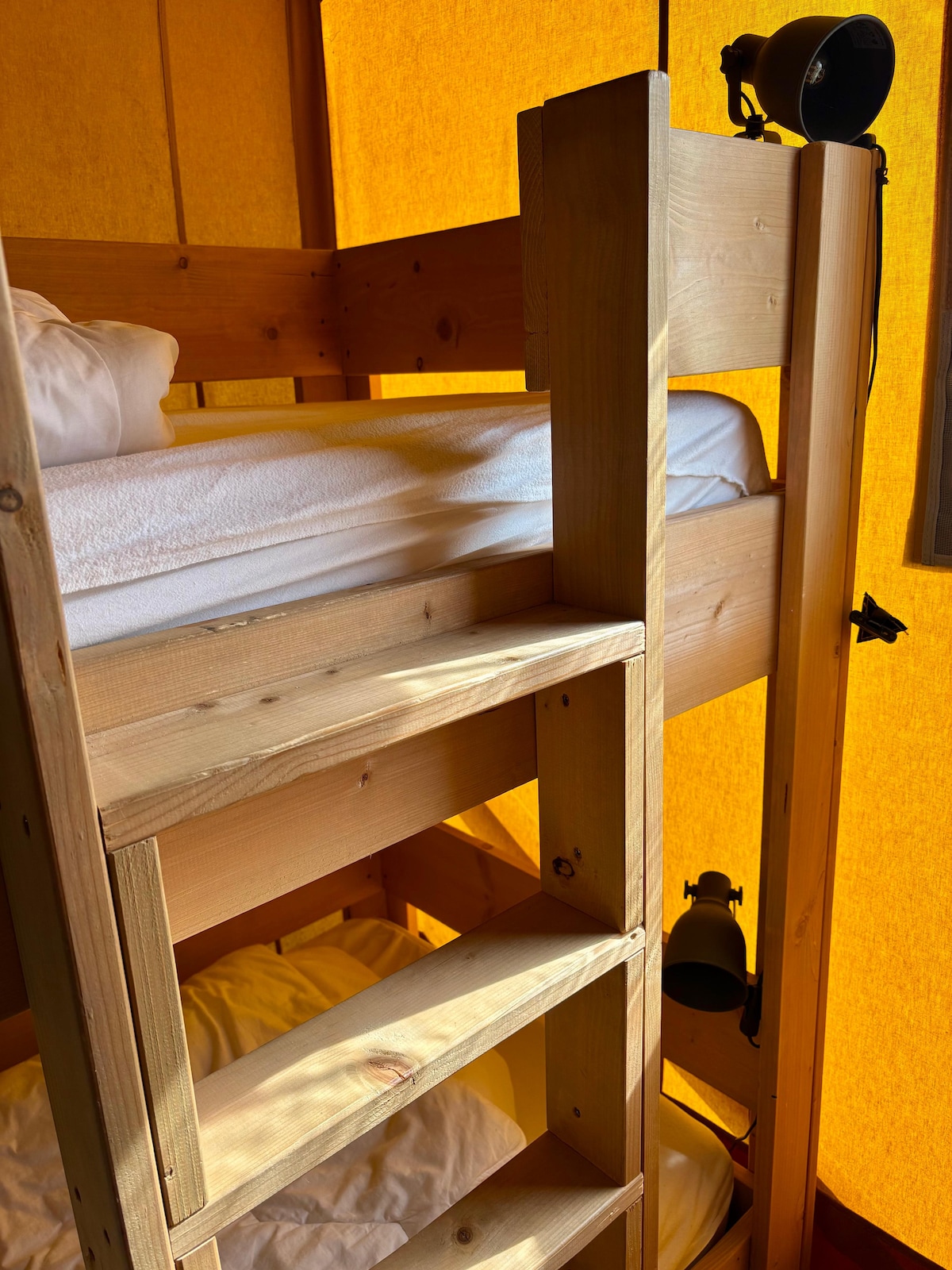Husker du de runde teltene fra barnebøker om eventyrere og oppdagelsesreisende i villmarken? Vårt klassiske Bell Tent bringer disse ungdomshistoriene til live, men med mer stil og komfort. Med en ekte seng er du trygg på en god natts søvn. Teltet er koselig innredet og utstyrt med dobbeltseng. Nyt naturen ute i en solseng. Tips: Bestill Bell-teltet vårt på en Glamping som er logget som et ekstra "soverom med dobbeltseng".