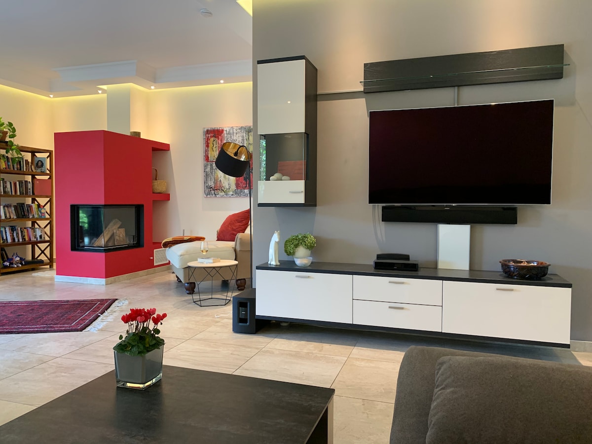 Loftsleilighet 20 minutter med bil fra Potsdam og Berlin og 30 minutter med tog fra BER. Romslig, fullt utstyrt designkjøkken*, bad med Agape Vieques badekar og matchende vask*, soverom med 2,70 m stor seng*, treningsrom kan brukes som et ekstra soveområde. Her er en 1,80 m dobbeltseng*Projektor med forhåndsinstallert app for NETFLIX, Disney + og Amazon Prime Login, leker, supermarked med baker og slakter, drikkevaremarked*Badesjøer og fotturer