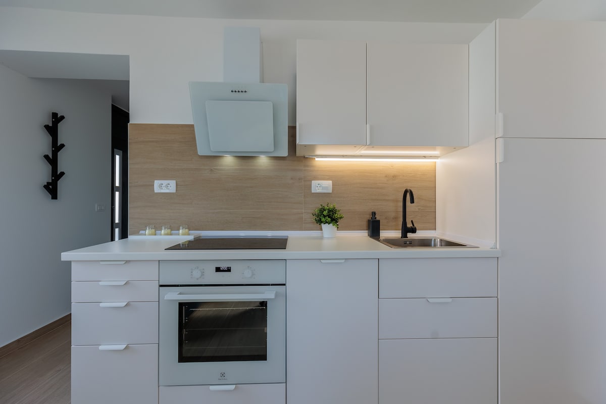 Oppdag den luksuriøse leiligheten «CAPE» i Rtina. Denne designleiligheten med to soverom i første etasje tilbyr privatliv, en romslig gårdsplass og et privat boblebad. En utmerket beliggenhet, bare noen få minutter med bil fra Pašman-broen, som kombinerer roen i naturen med nærheten til Zadar (30 minutter). Det er et ideelt valg for familier som ønsker førsteklasses komfort. Du vil bli betatt av den fantastiske panoramautsikten over havet og de nærliggende øyene. Men den virkelige stjernen i showet er den praktfulle solnedgangen, som du kan nyte rett fra den varme boblebadet.