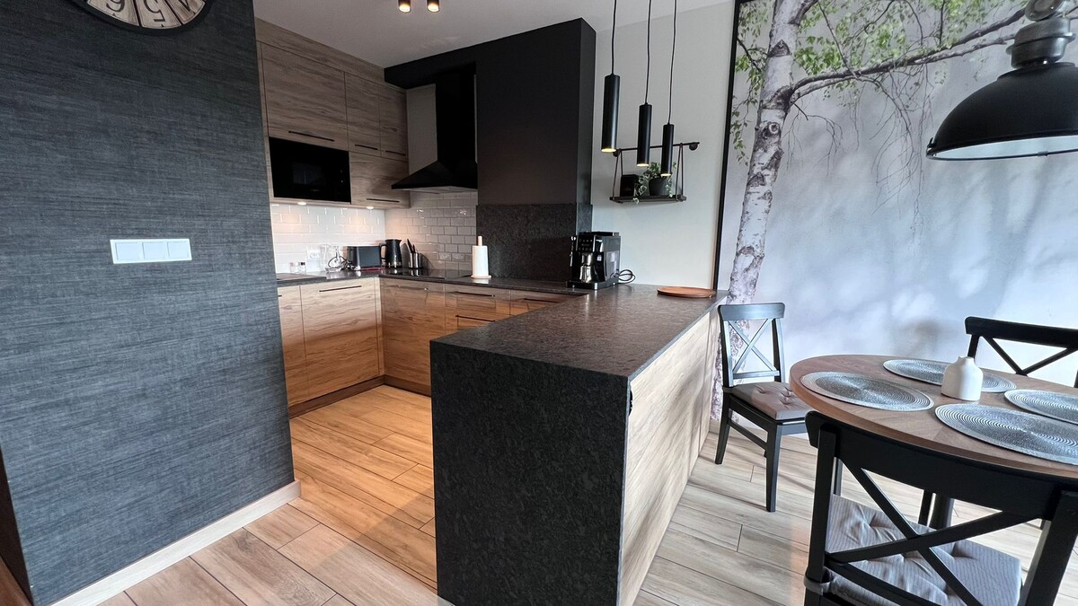 Ny leilighet i moderne stil for maks fire personer (dobbeltseng, sammenleggbar sofa). Kjøkkenet har oppvaskmaskin, kjøleskap, fryser, stekeovn, induksjonskomfyr og elektrisk vannkoker. TV, trådløst nettverk. Badet har hårføner og vaskemaskin. Leiligheten ligger på Ogrodowa Street 4 i sentrum av byen Lodz. 300 meter til kjøpesenteret Manufaktura med gratis døgnåpen parkering. 400 meter til hovedgaten Piotrkowska. I nærheten av huset er det en Zhabka-butikk, kafé, restaurant, i-max-kino.