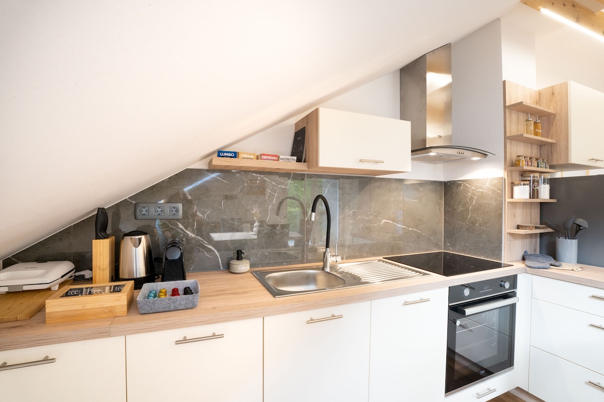 Leiligheten Gabrijel ligger på et fredelig sted i uberørt natur, unna byens kjas og mas. Her kan du nyte freden, roen og den friske luften. Jezernica-elven, som flyter forbi huset, lager en behagelig, plaskende lyd. Det lille kjøkkenet er romslig nok til at du kan tilberede hjemmelaget te og ordentlig slovensk kaffe. Når du lager en av disse drikkene, kan du slappe av på en nydelig terrasse med utsikt over den nærliggende beitemarken hvor hestene beite.