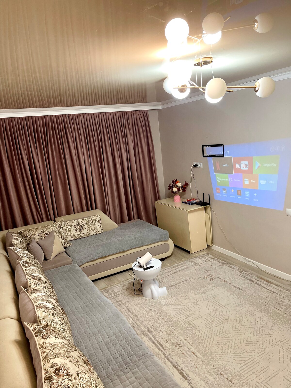 Koselig leilighet til leie ⭐️MED EN KINO ⭐️ DET ER JAYSTICS-SPILL ⭐️ BRETTSPILL ⭐️ SUPERTRÅDLØST NETTVERK ⭐️ MIKROBØLGEOVN, HÅRTØRKER, STRYKEJERN, OPPVASK – Alle detaljer er gjennomtenkt for din komfort og kos. – Perfekt renhold, alltid ny seng, håndklær, tøfler. – Det er sjampo, såpe, pulver, tøymasker og forskjellige fine ting for å ta vare på deg. - Ny renovering, nye møbler – I nærheten er det en Basket, Firkan, apotek osv.