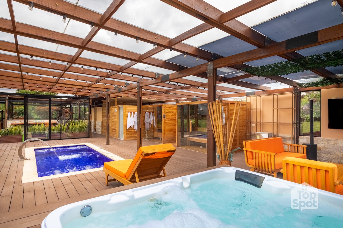 OVERNATTING KUN FOR FAMILIER. FAMILY-ONLY ACCOMMODATION. Eiendom på 10 500 kvm, ideell for avslapning, 25 km fra Bogotá: tre soverom, seks bad og spektakulære sosiale områder. SPA* med jacuzzi, massasjebasseng, badstue og tyrkisk: Treningsrom. Tre rom med peis, arrangementsområder, fullt utstyrt kjøkken, kontorfellesskap, biljard, shuffleboard, fotballbane, bordtennis, romslige hager, grill og+ Ikke forlat turen din tilfeldig. Bestill med TopSpot® -garanti og -opplevelse