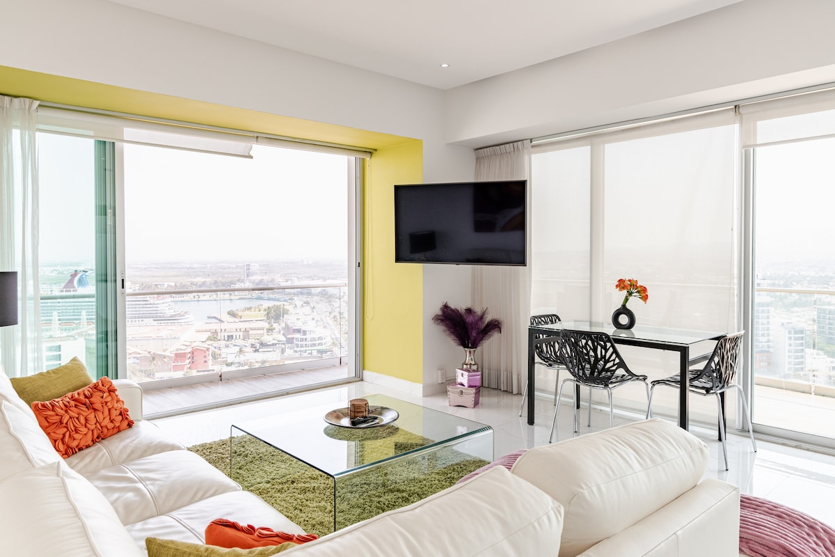 Denne moderne leiligheten med én soverom og ett bad ligger i tredje etasje i Tower 1000 i Grand Venetian-leiligheter. Uhindret fantastisk utsikt over stranden, et privat boblebad, fasiliteter av høy kvalitet, tjenester, sikkerhet og pålitelig høyhastighets internett, vil gjøre oppholdet ditt uforglemmelig. Innredet mellom nabolagene Downtown og Marian Vallarta, i nærheten av La Isla kjøpesenter, restauranter, natteliv og offentlig transport. Det er praktisk og fleksibelt å utforske byen.